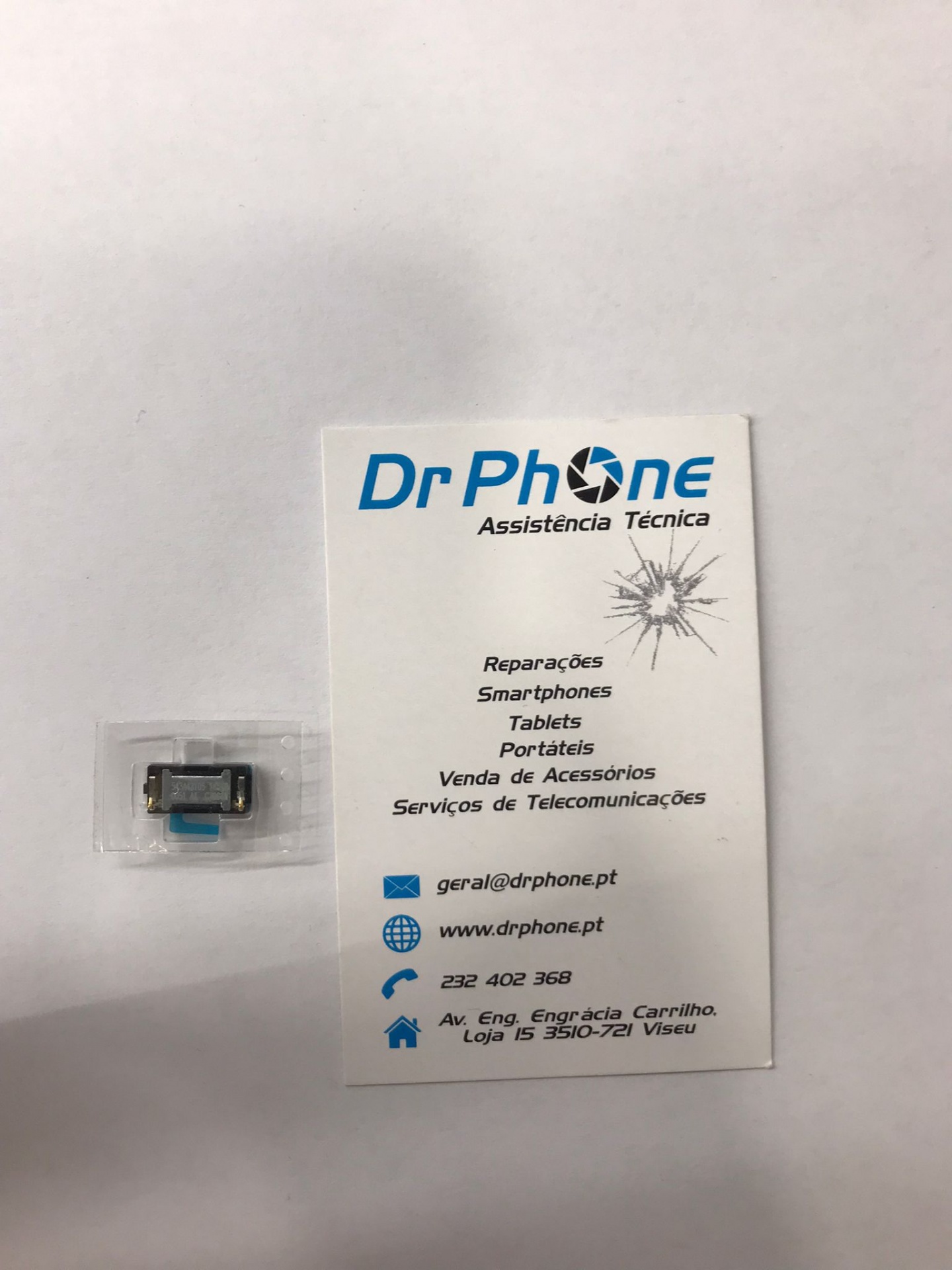 Componente eletrónico pequeno e cartão de visita da Dr Phone Assistência Técnica