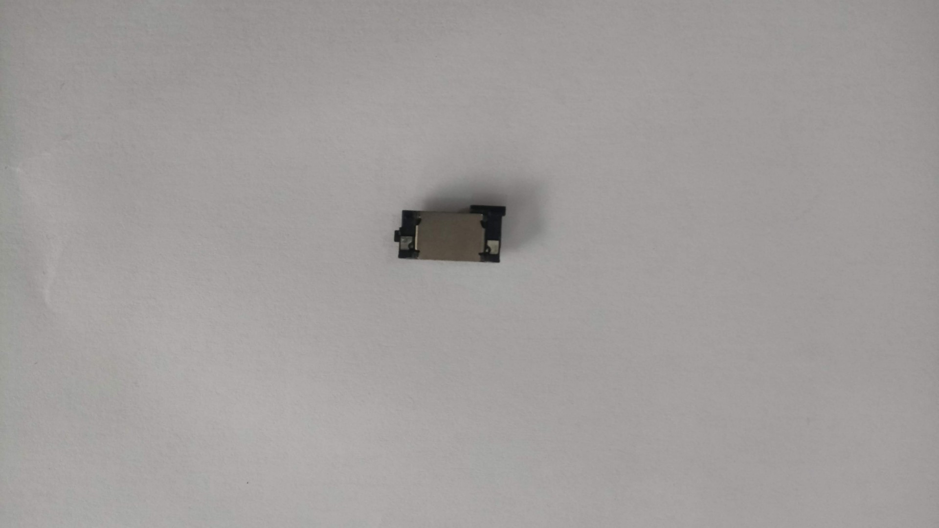 Componente eletrónico pequeno retangular prateado e preto sobre fundo branco