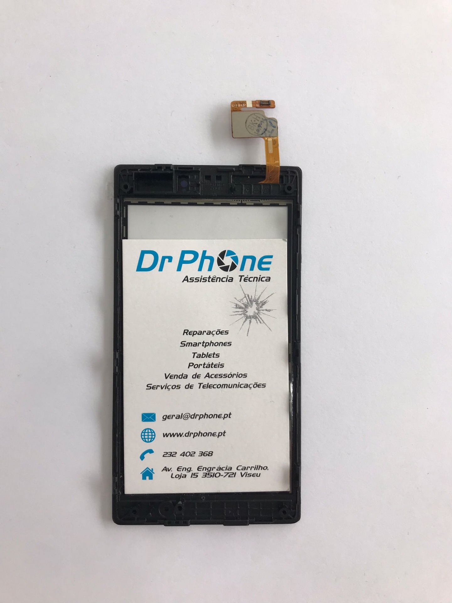 ecrã tátil preto para smartphone com cabo flexível amarelo e cartão da assistência técnica Dr Phone