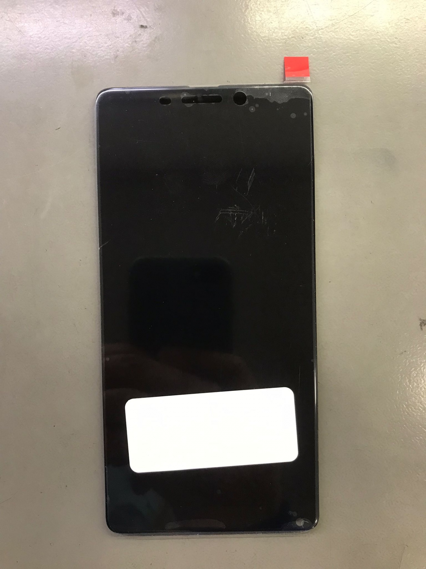 Ecrã vermelho de smartphone com cabo flexível preto e etiquetas em fundo cinza