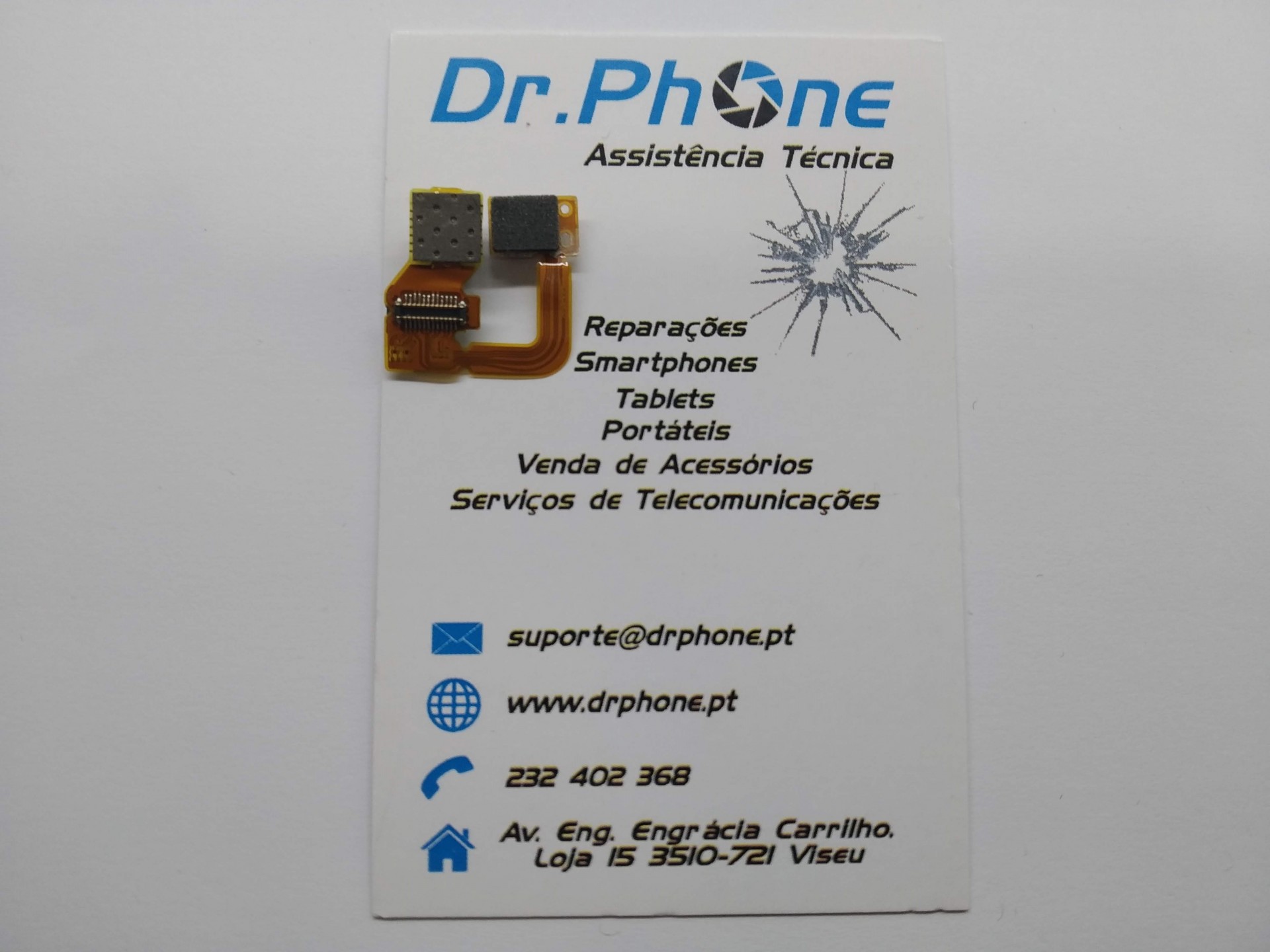 Cartão de visita da Dr. Phone com pequeno componente eletrônico em cima