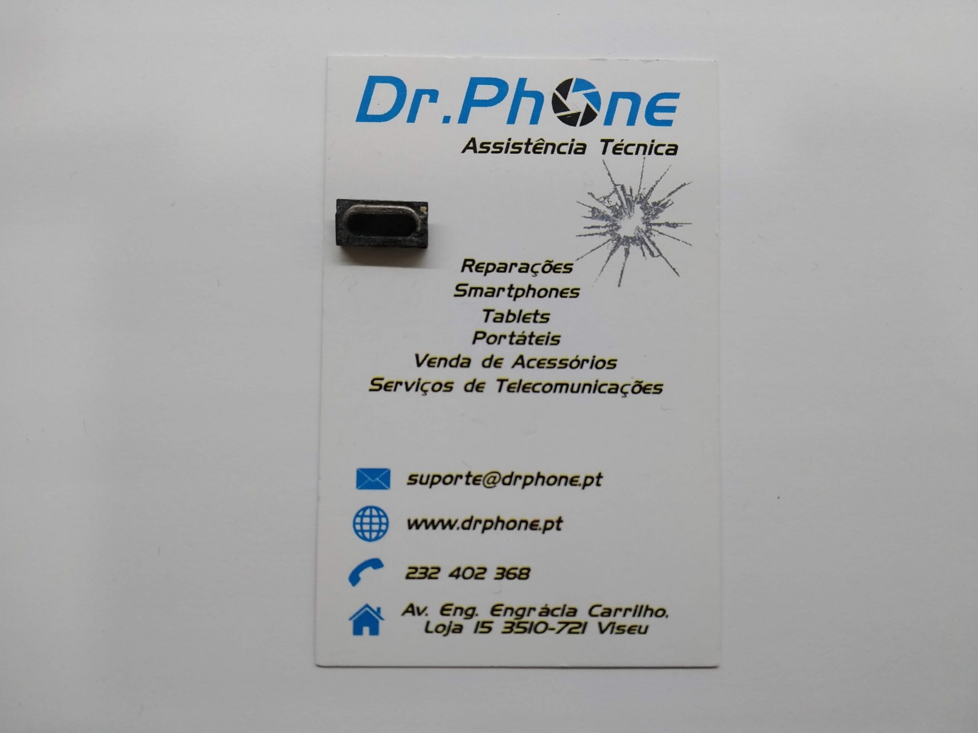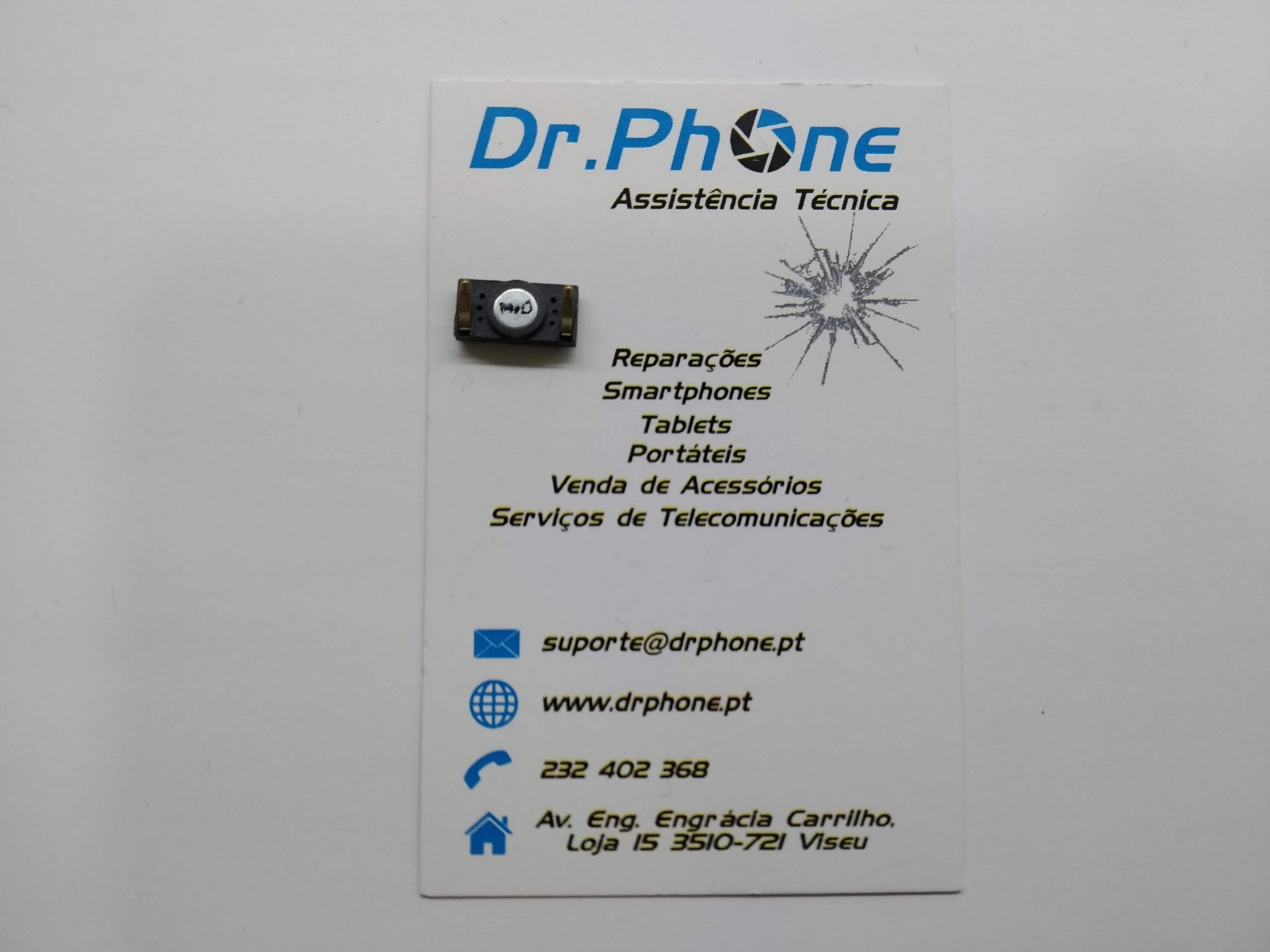 Cartão de visita Dr.PHONE com informação de assistência técnica e componente eletrónico colado