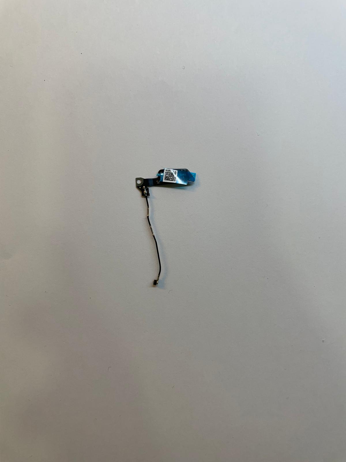 Peça eletrónica pequena com cabo fino sobre superfície branca