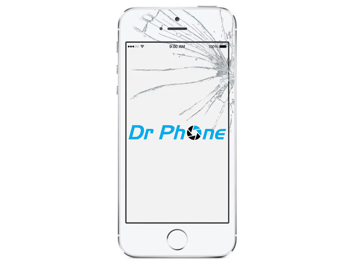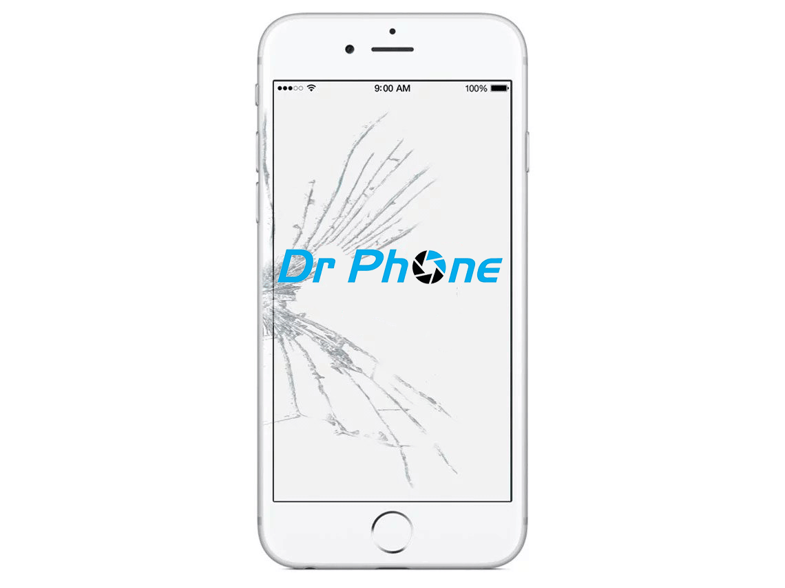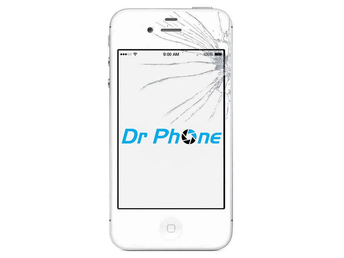 Smartphone branco com ecrã rachado e texto Dr Phone no centro do ecrã