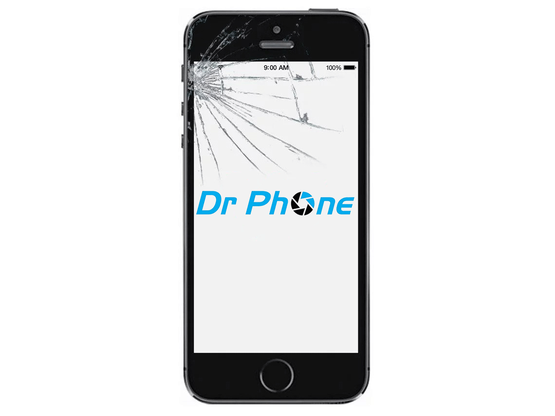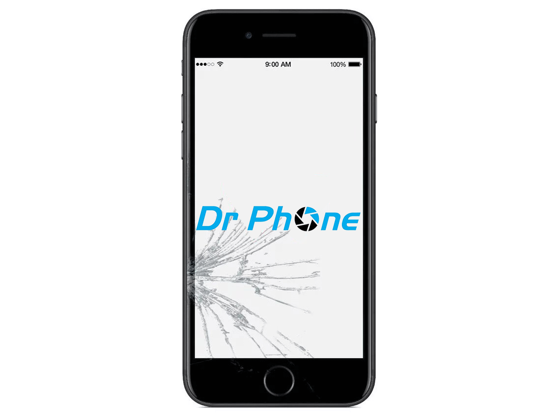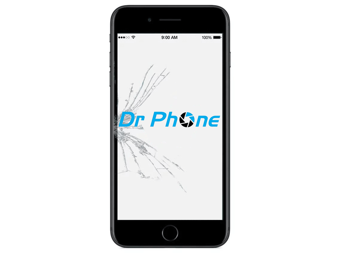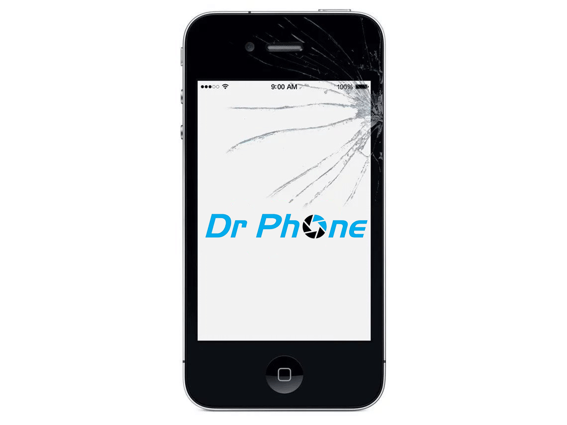 Smartphone preto com ecrã partido e logotipo Dr Phone no ecrã