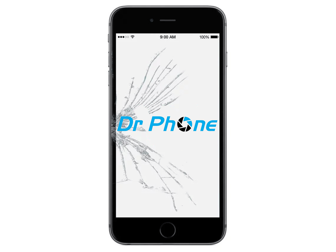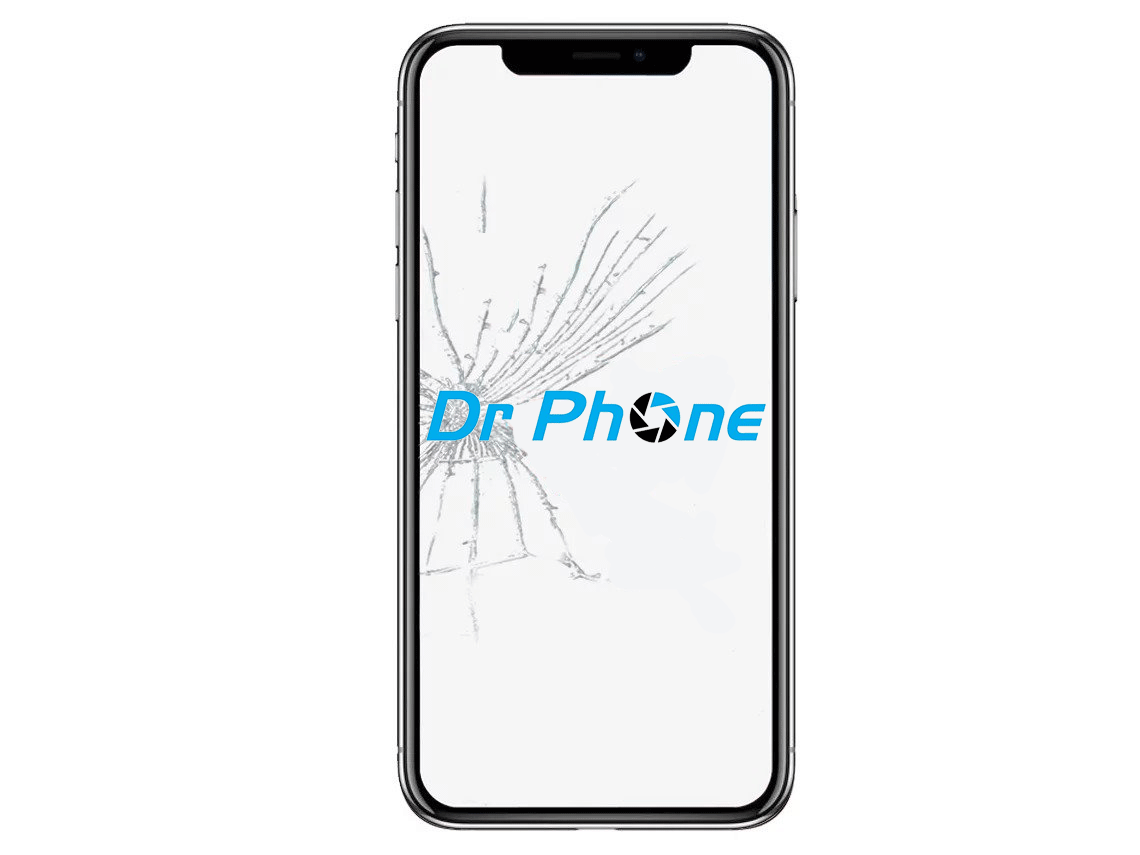 Smartphone com ecrã partido e texto Dr Phone no ecrã