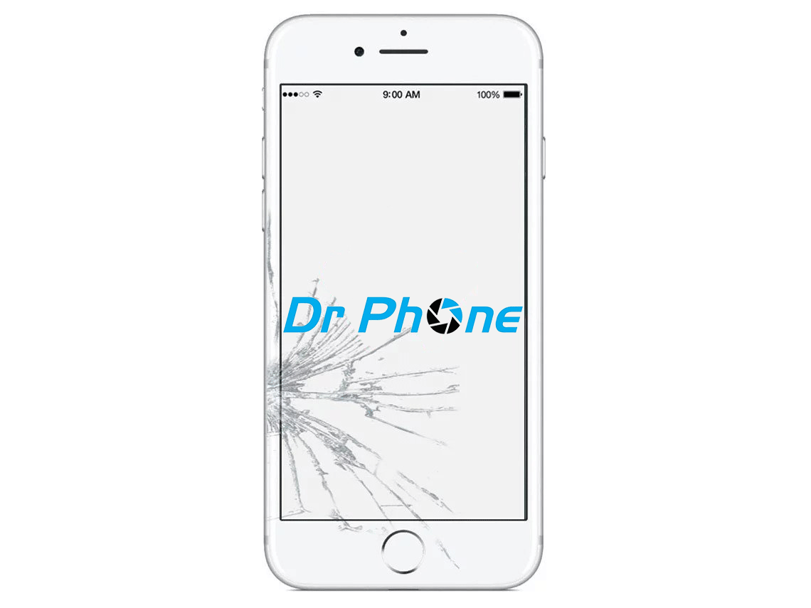 Smartphone branco com ecrã partido e texto Dr Phone azul no ecrã