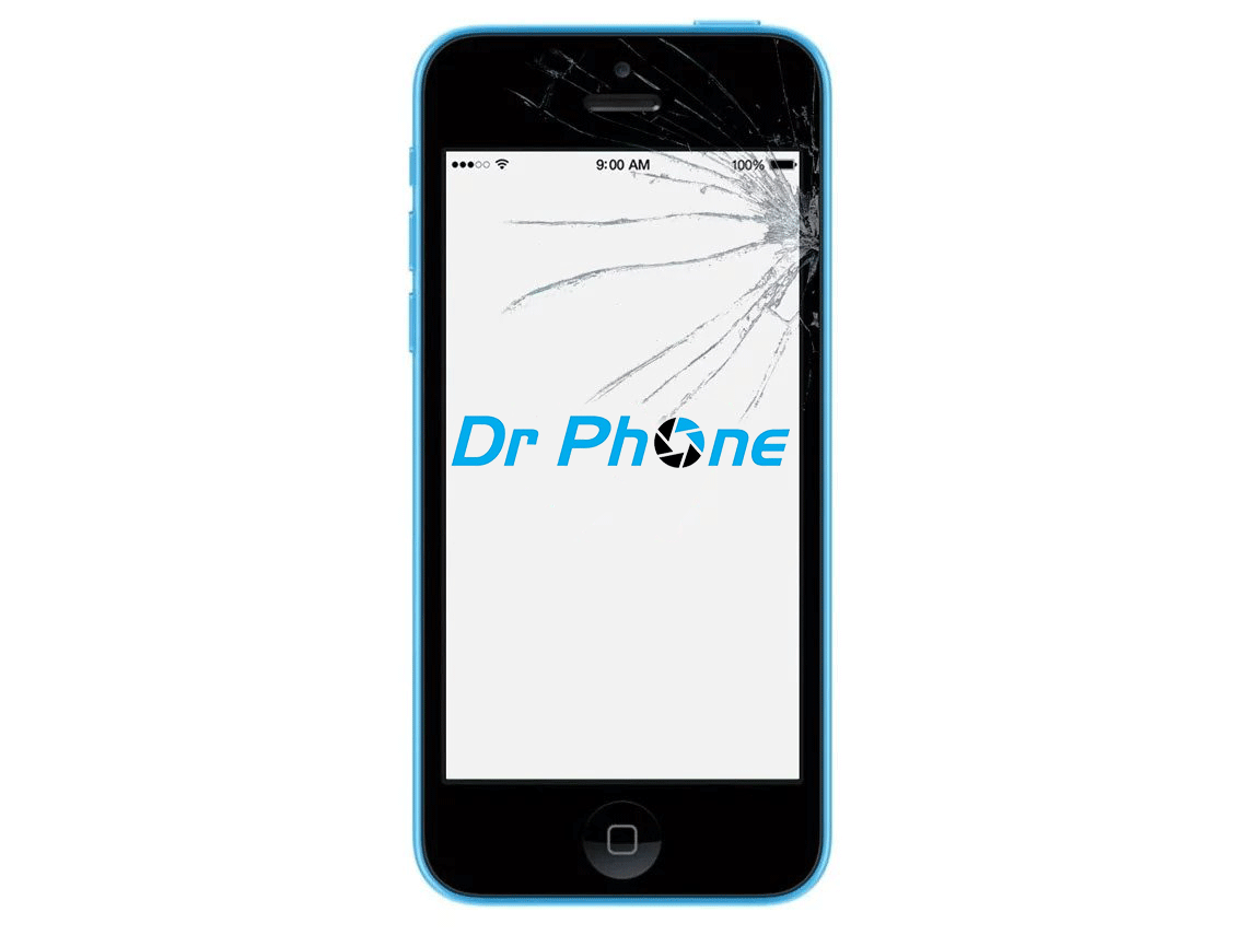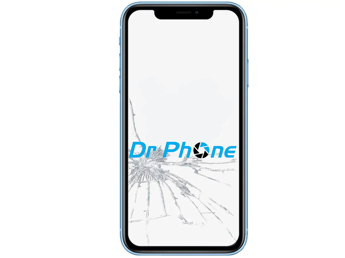 Smartphone azul escuro com ecrã partido e texto Dr Phone