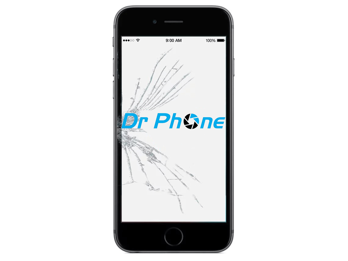 Smartphone preto com écrã rachado e texto Dr Phone no écran.