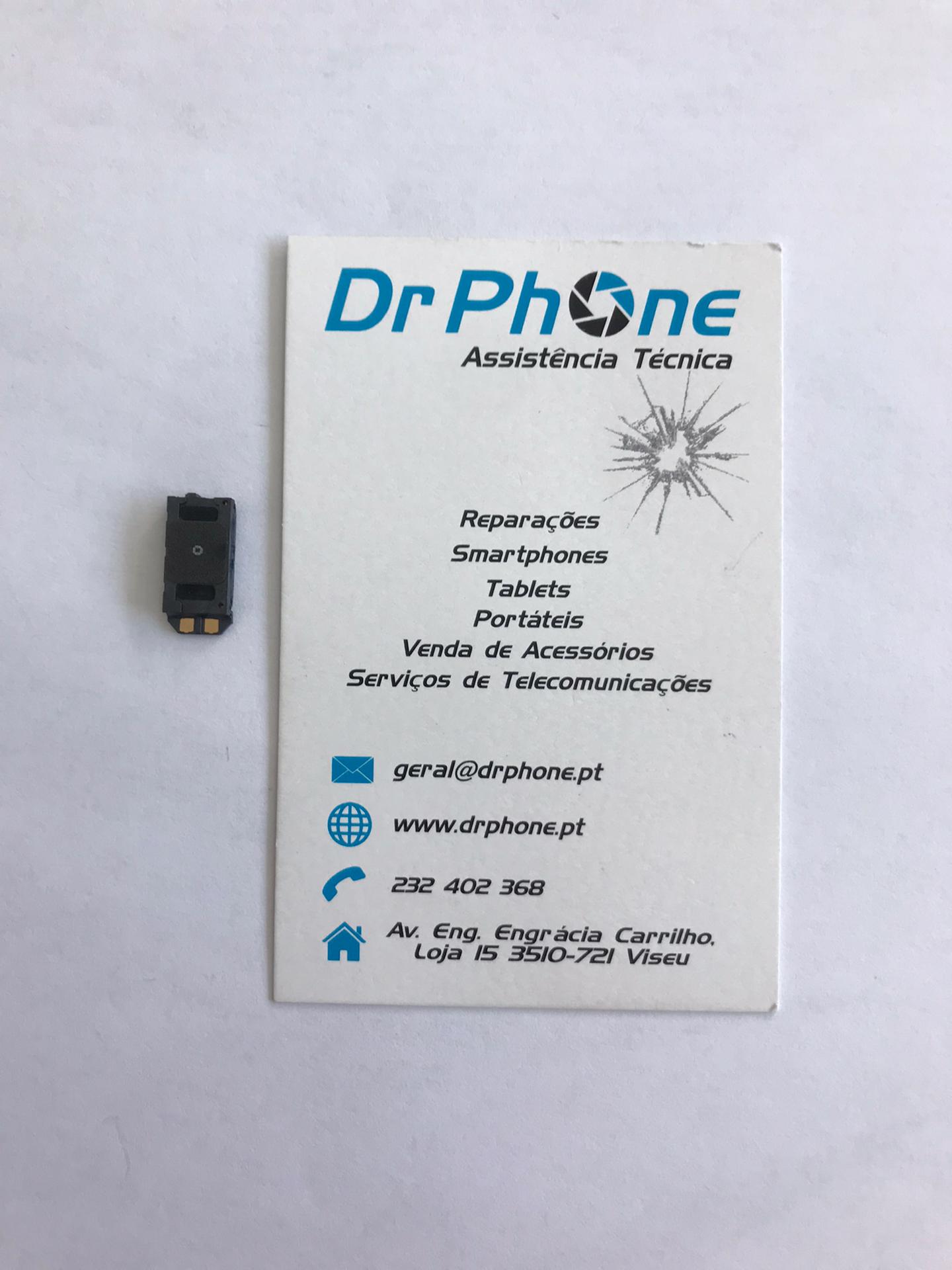Peça eletrónica preta junto a cartão de visita da Dr Phone Assistência Técnica