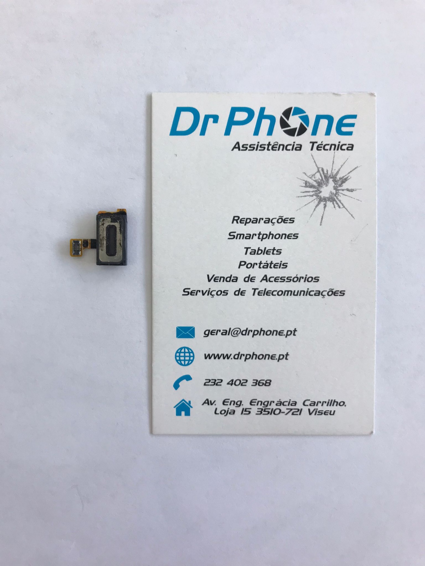Cartão de visita da Dr Phone Assistência Técnica com peça eletrónica pequena ao lado
