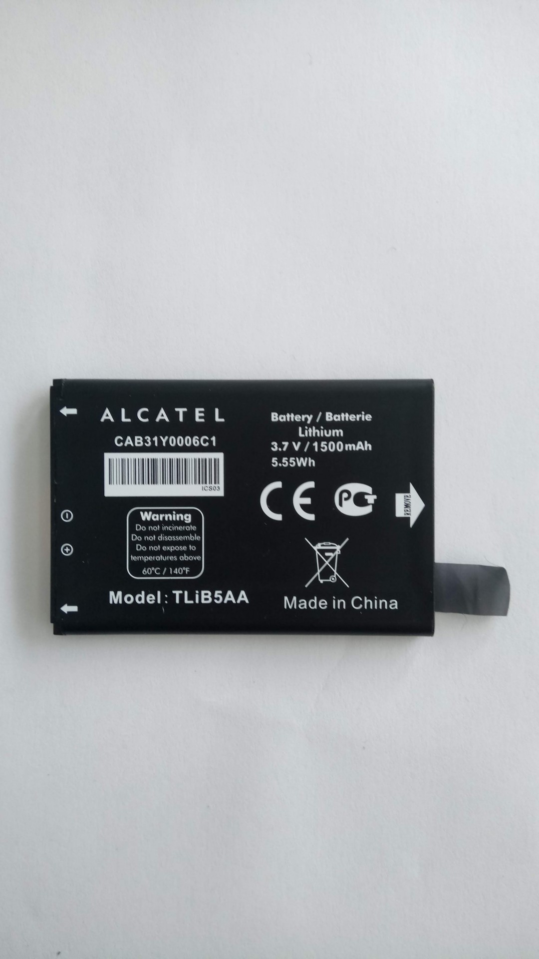 Bateria de lítio preta da Alcatel com texto e símbolos brancos, sobre fundo branco.