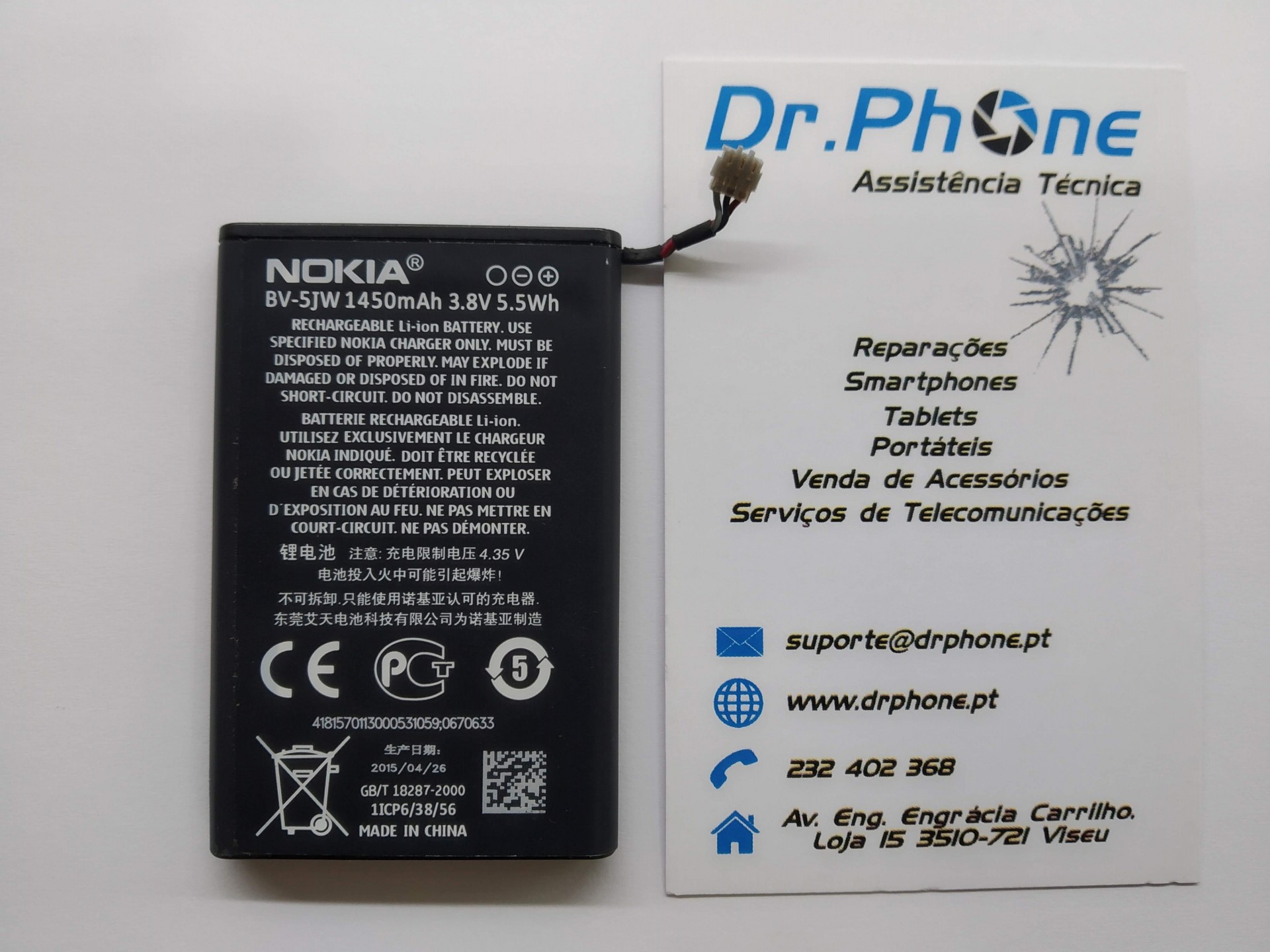 Bateria recarregável Nokia BV-5JW preta ao lado de cartão de visita Dr.Phone