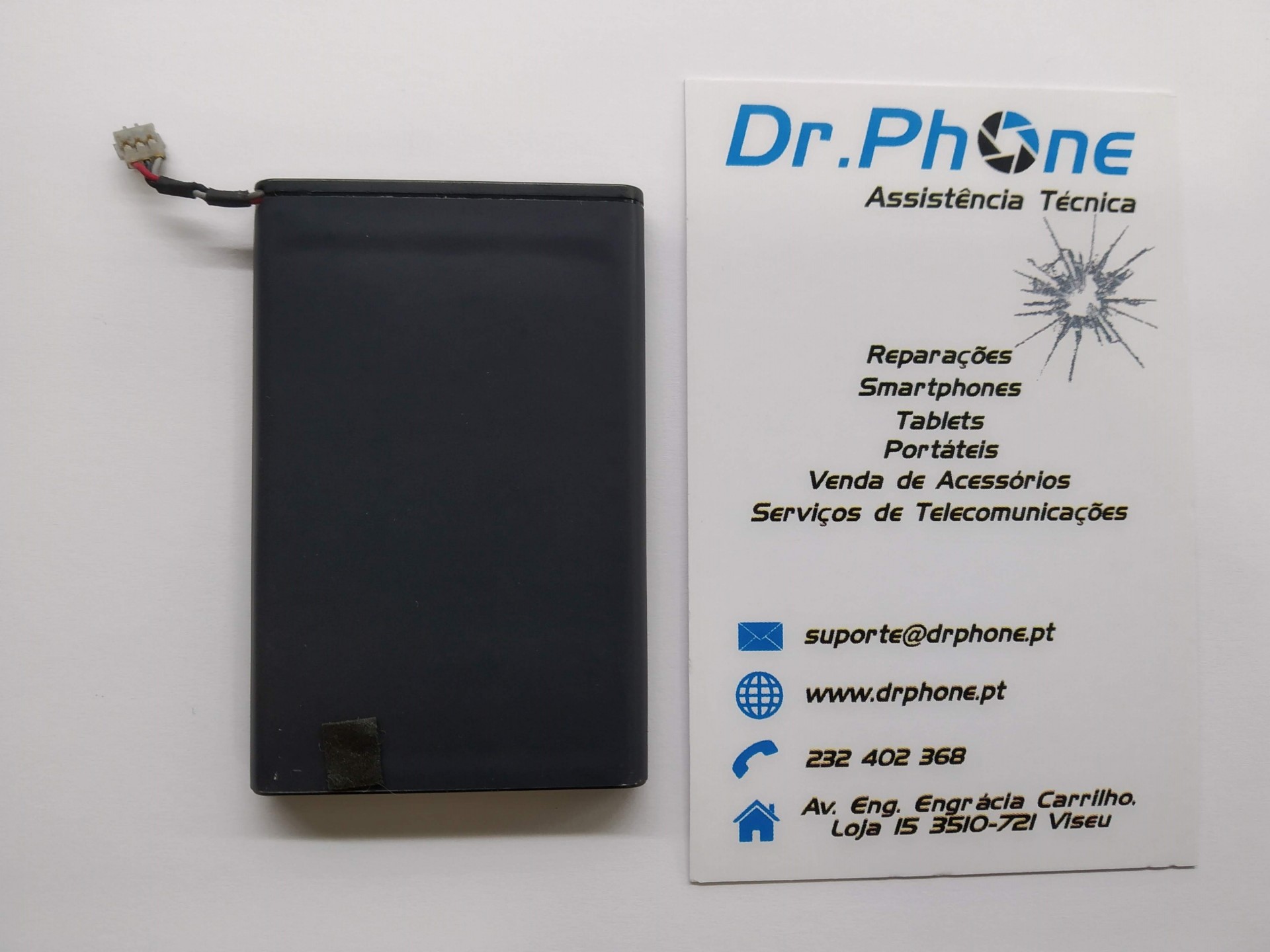 Bateria preta retangular ao lado de cartão de visita da Dr.Phone para assistência técnica