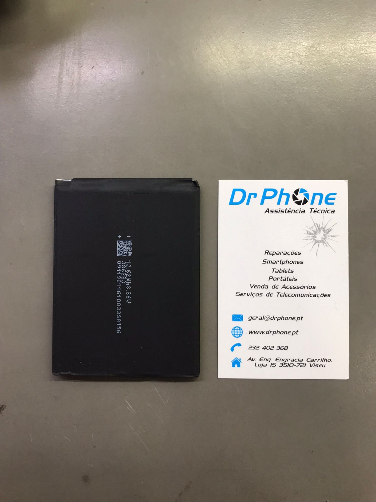 Bateria Huawei preta e cartão de visita Dr Phone sobre fundo cinzento