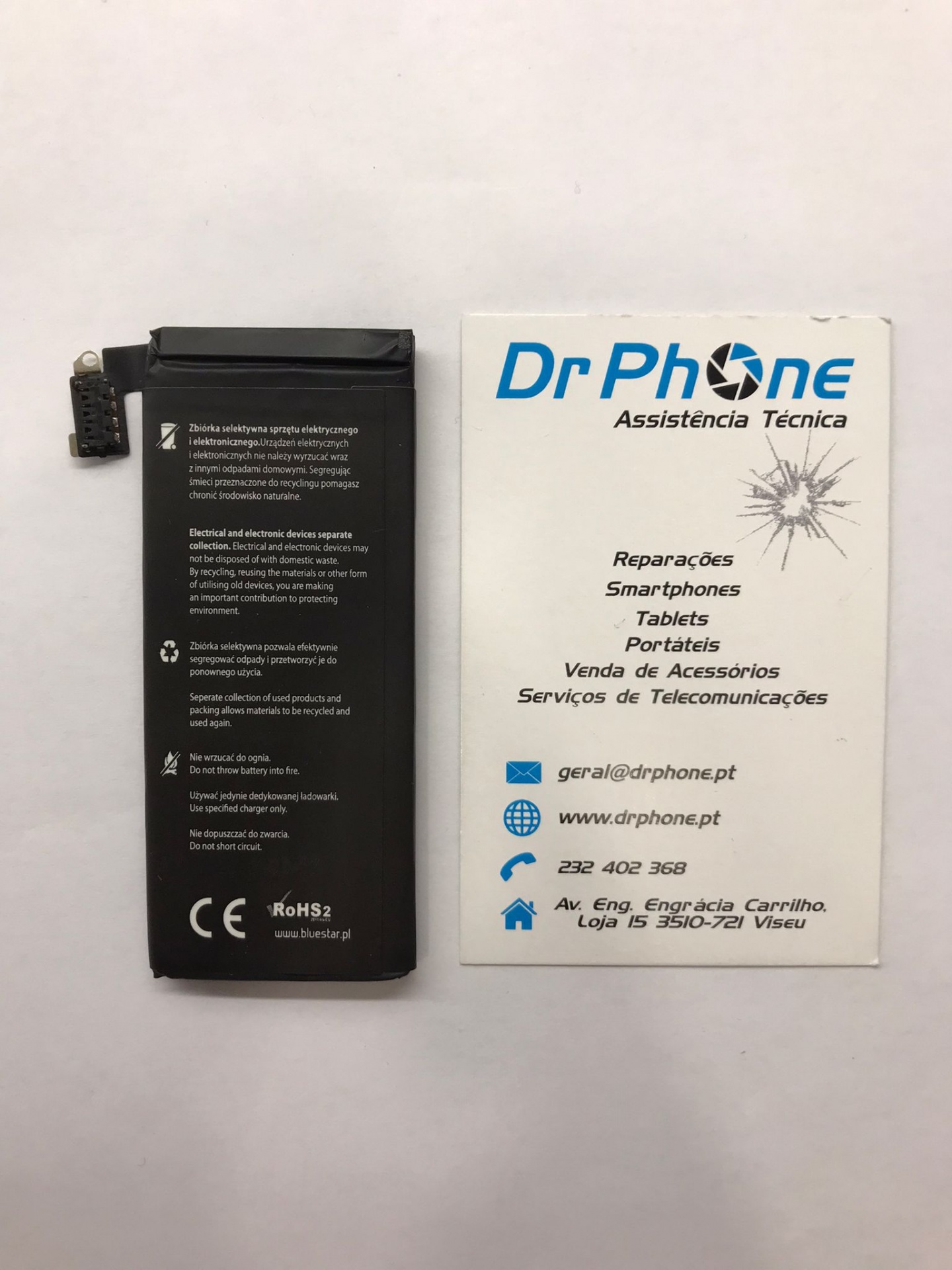 Bateria de smartphone preta ao lado de cartão de assistência técnica Dr Phone