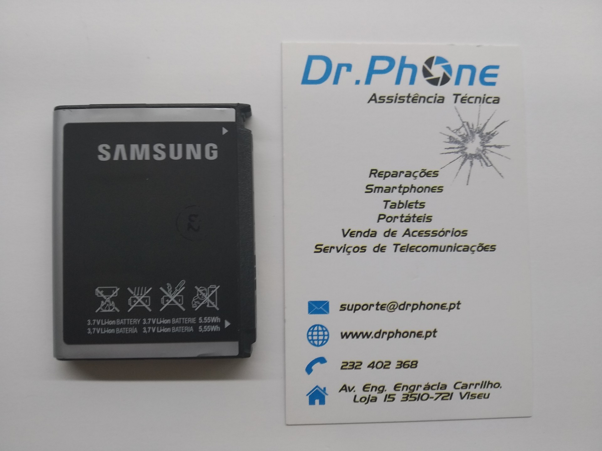 Bateria Samsung preta ao lado de cartão de visita Dr.Phone Assistência Técnica