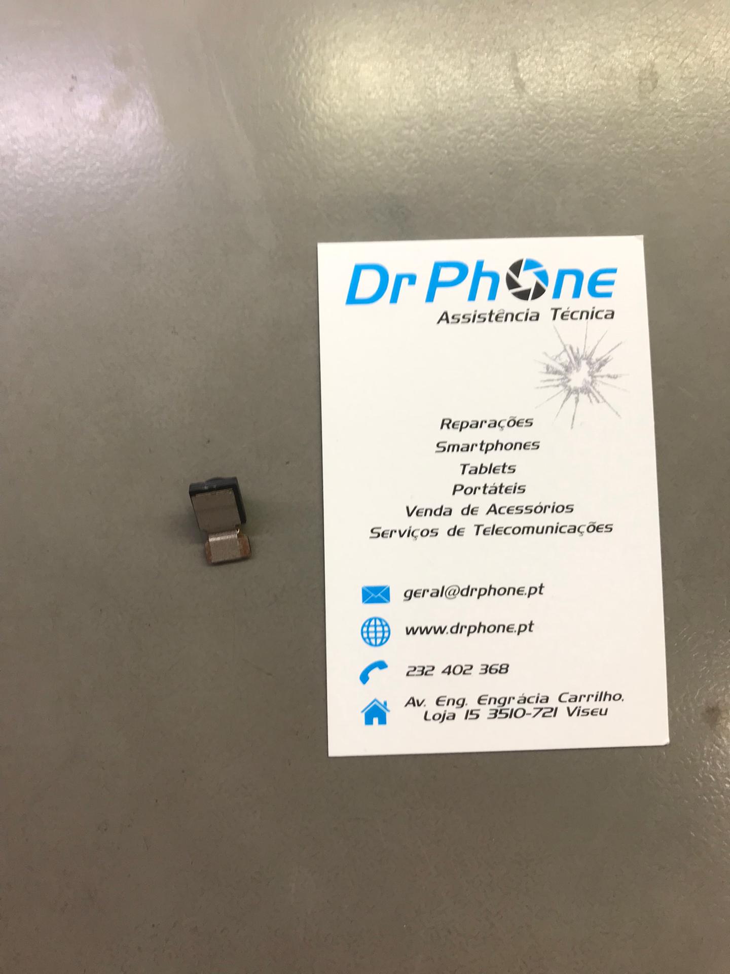 Câmara pequena para smartphone e cartão de visita da Dr Phone Assistência Técnica em superfície cinzenta