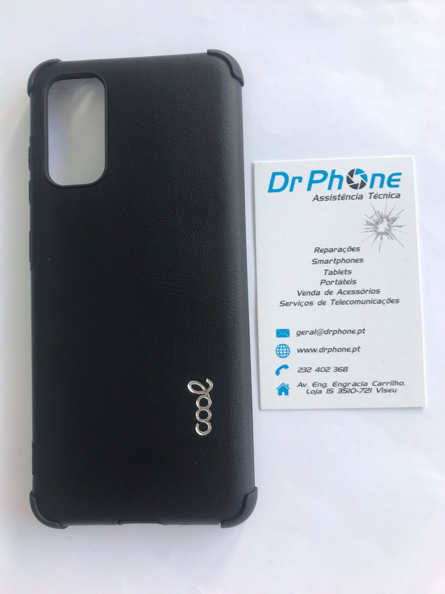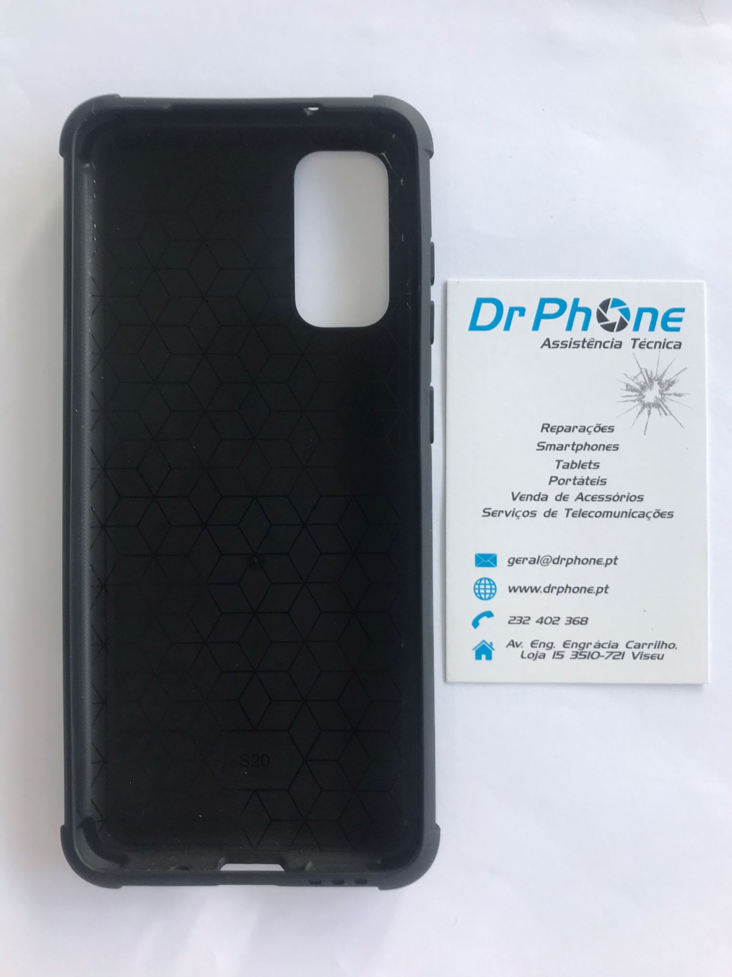 Capa preta de telemóvel com padrão geométrico e cartão de visita da Dr Phone