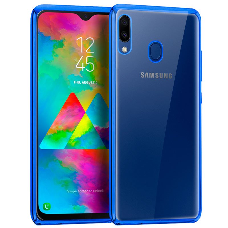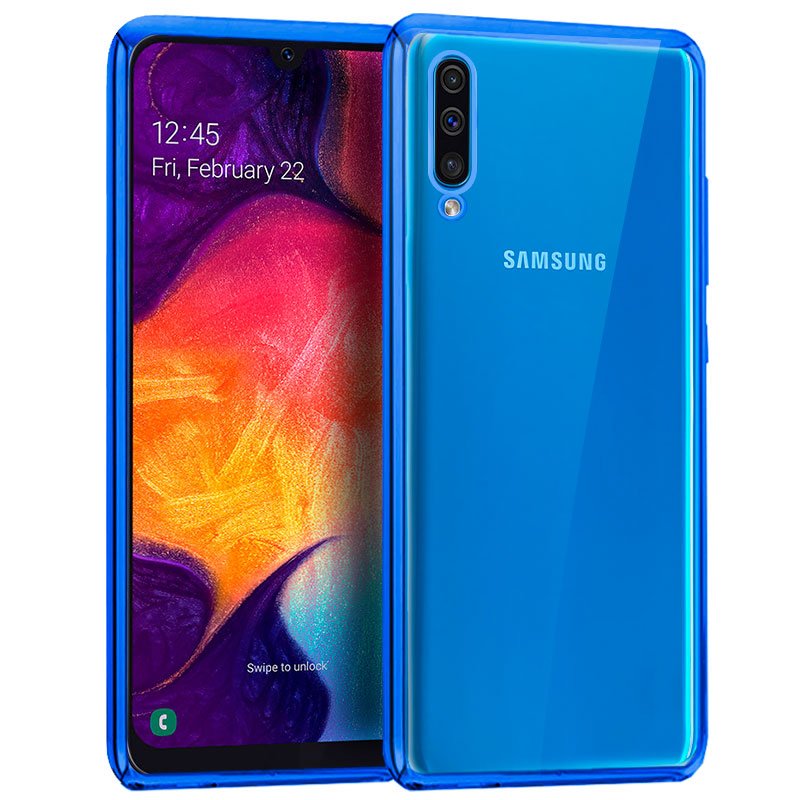 Smartphone Samsung azul com capa transparente e ecrã colorido