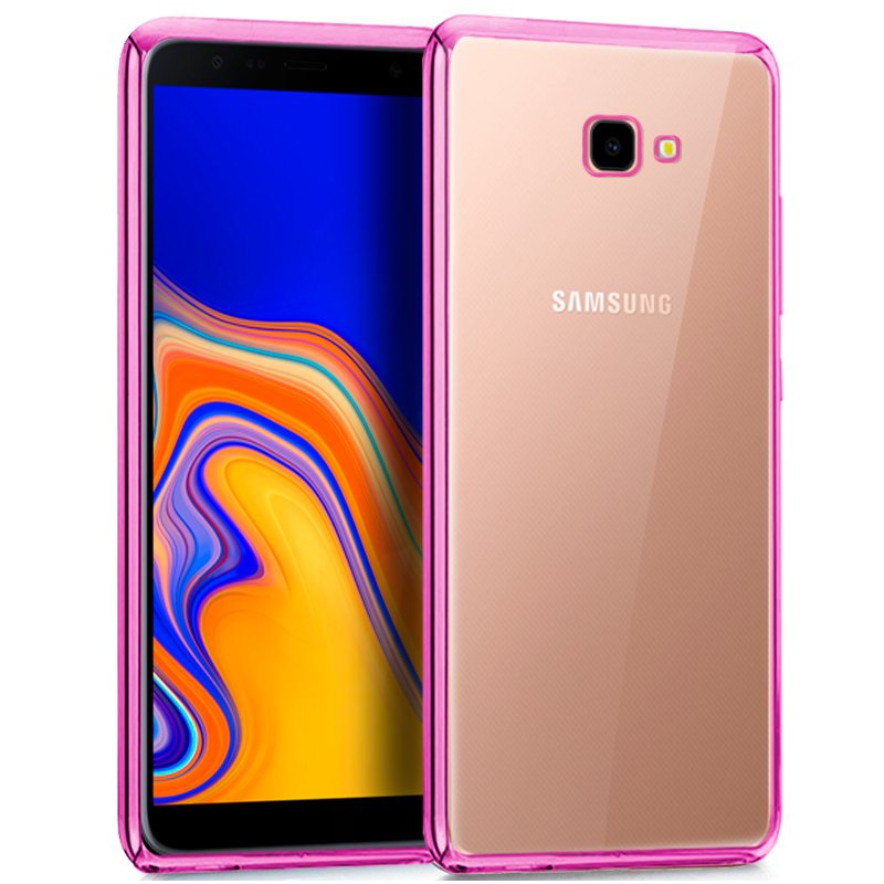 Smartphone Samsung azul com capa rosa translúcida e ecrã colorido
