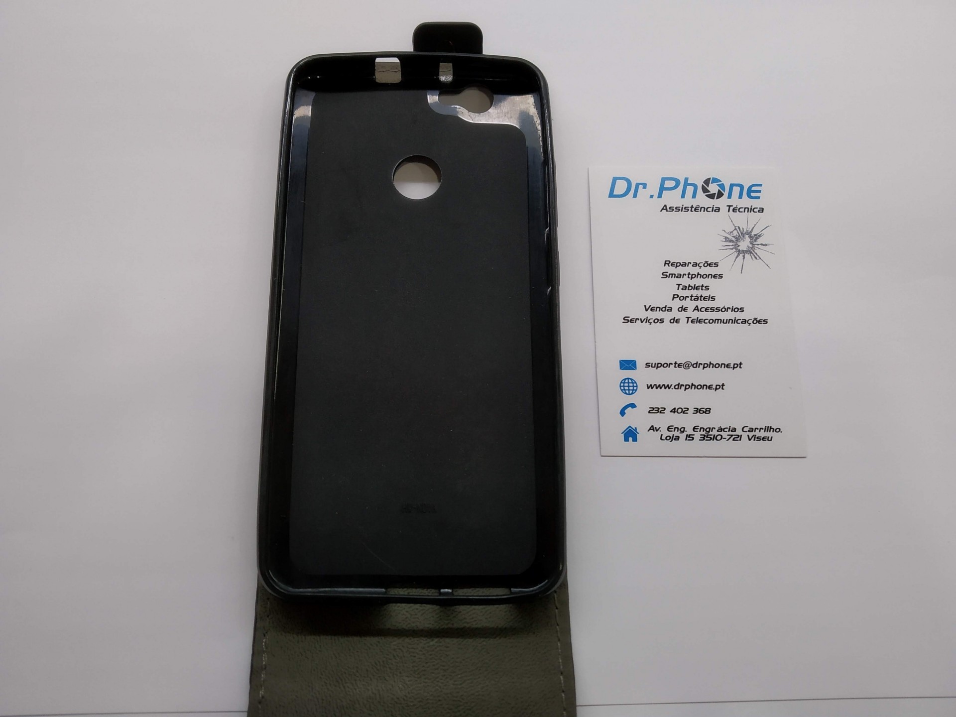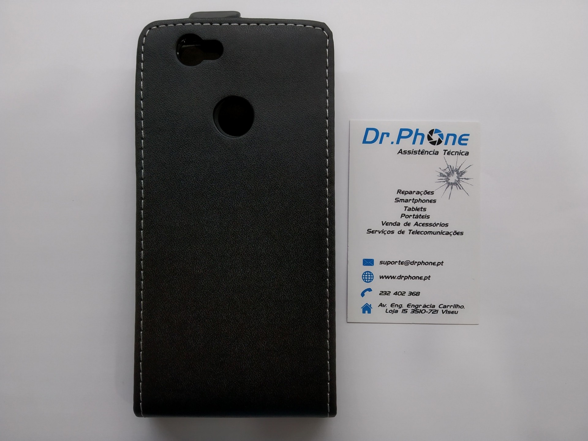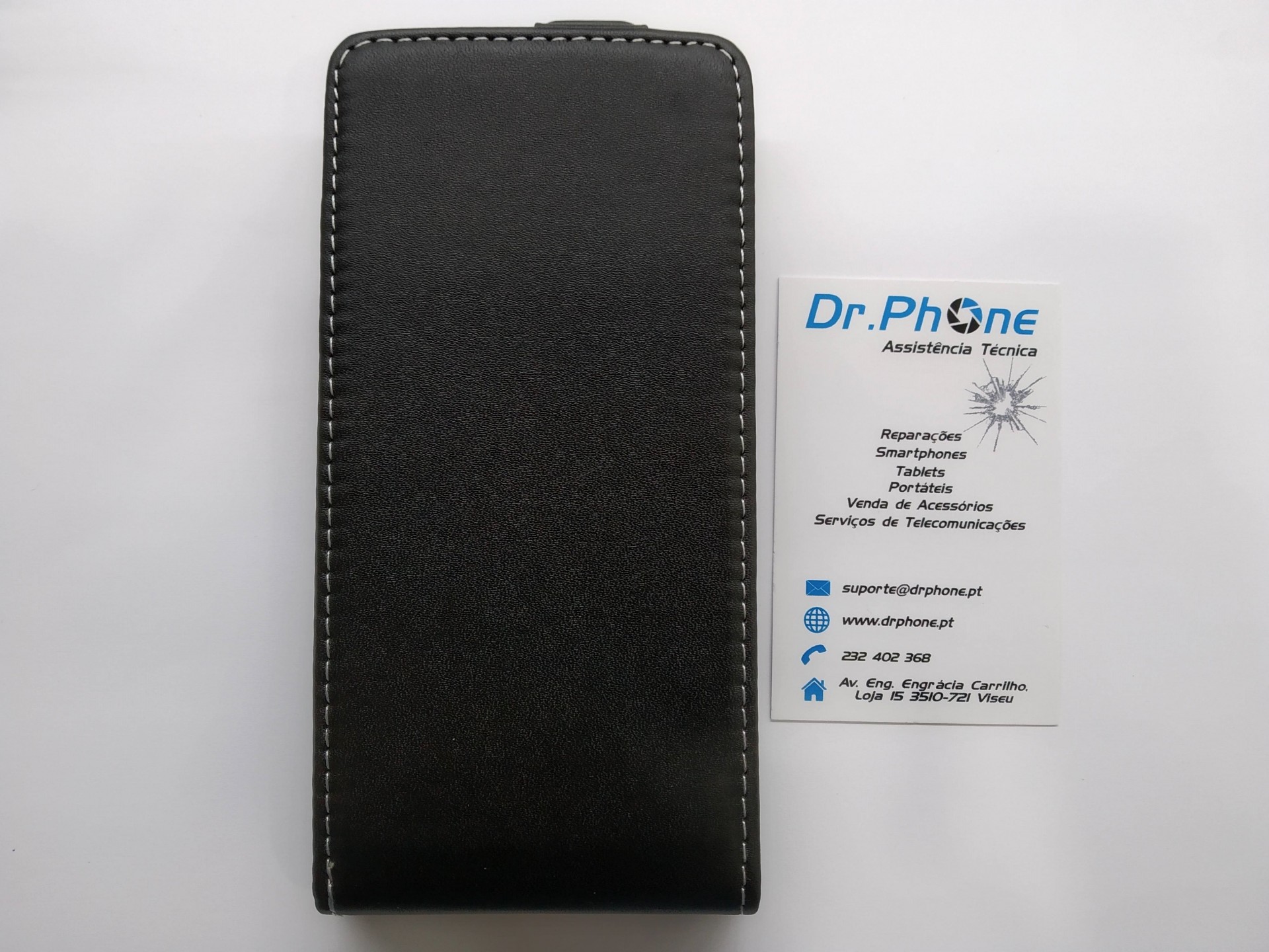 Capa protetora preta para smartphone ao lado de cartão de visita Dr.PHONE
