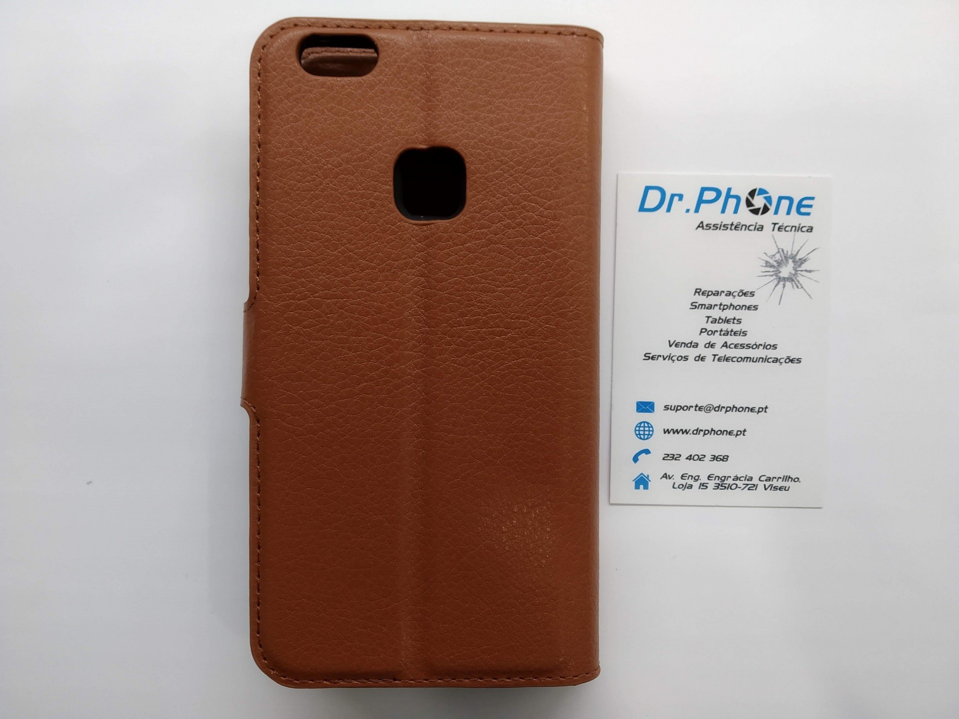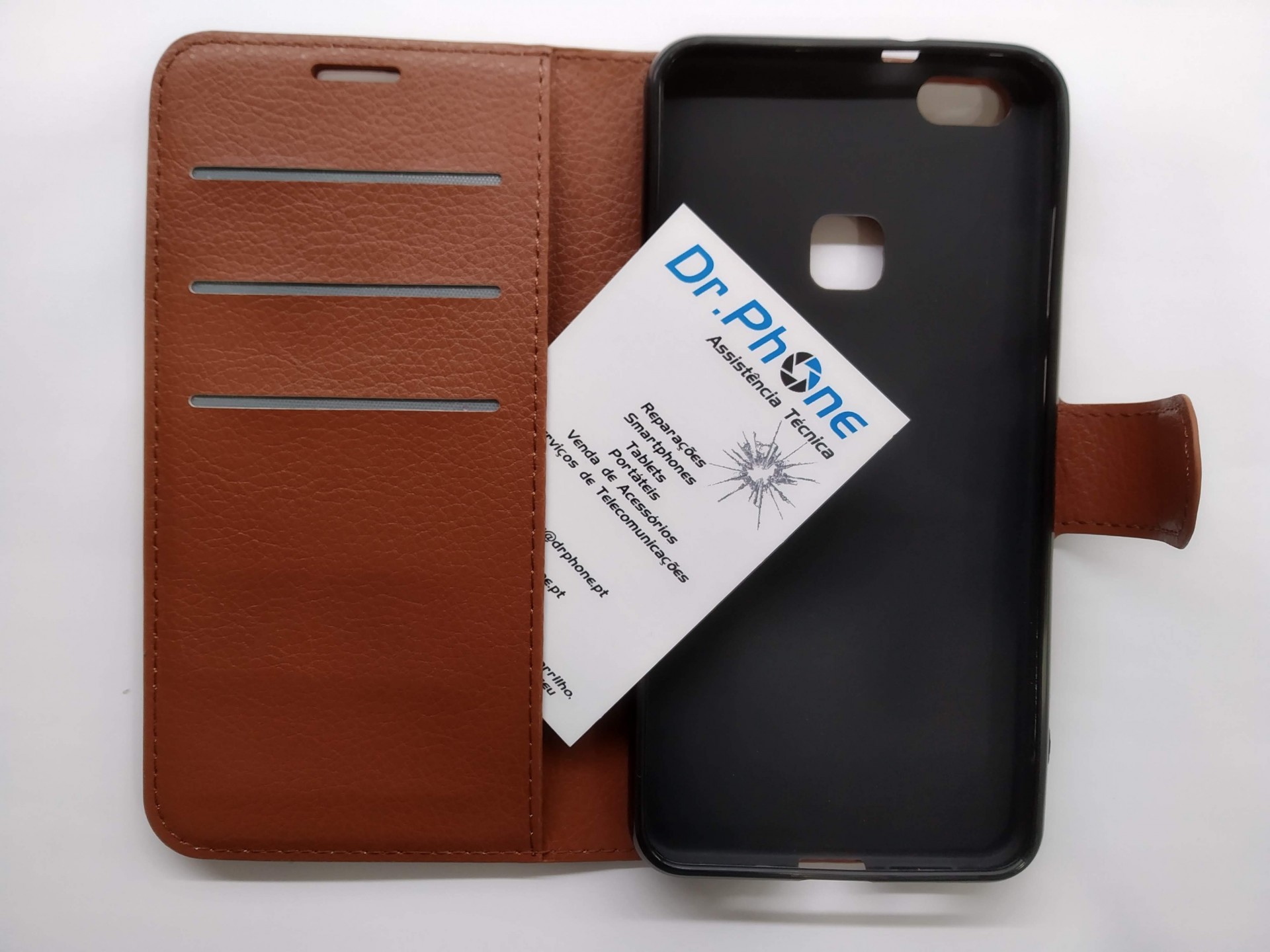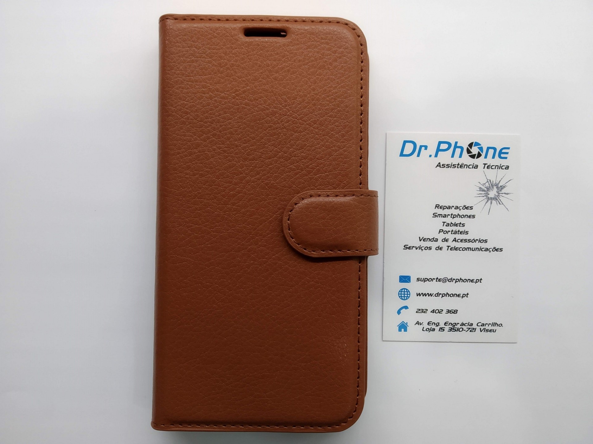 Capa castanha para telemóvel com cartão de visita da empresa Dr. Phone