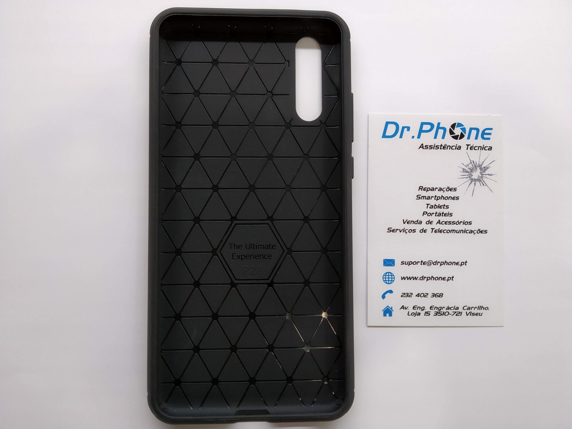 Capa de telemóvel preta com padrão de triângulos e cartão de visita da Dr.Phone