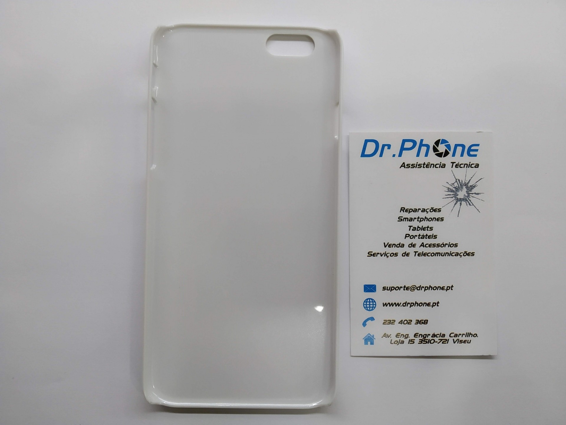Capa branca translúcida de telemóvel ao lado de cartão de visita da Dr.Phone