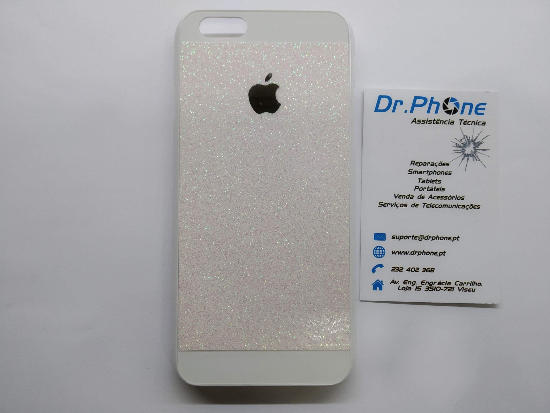 Capa telemóvel branca brilhante com logótipo Apple e cartão de visita Dr.Phone