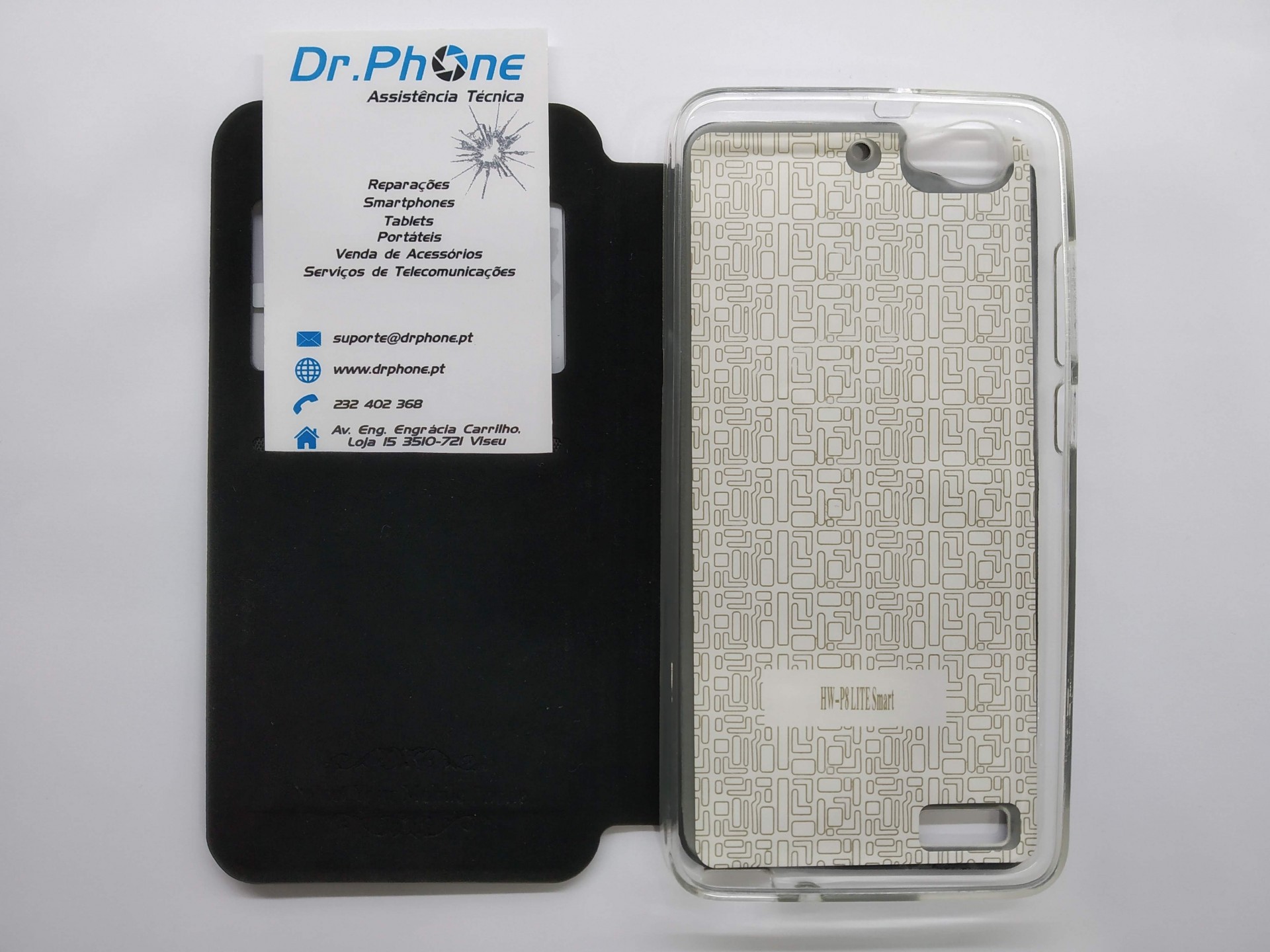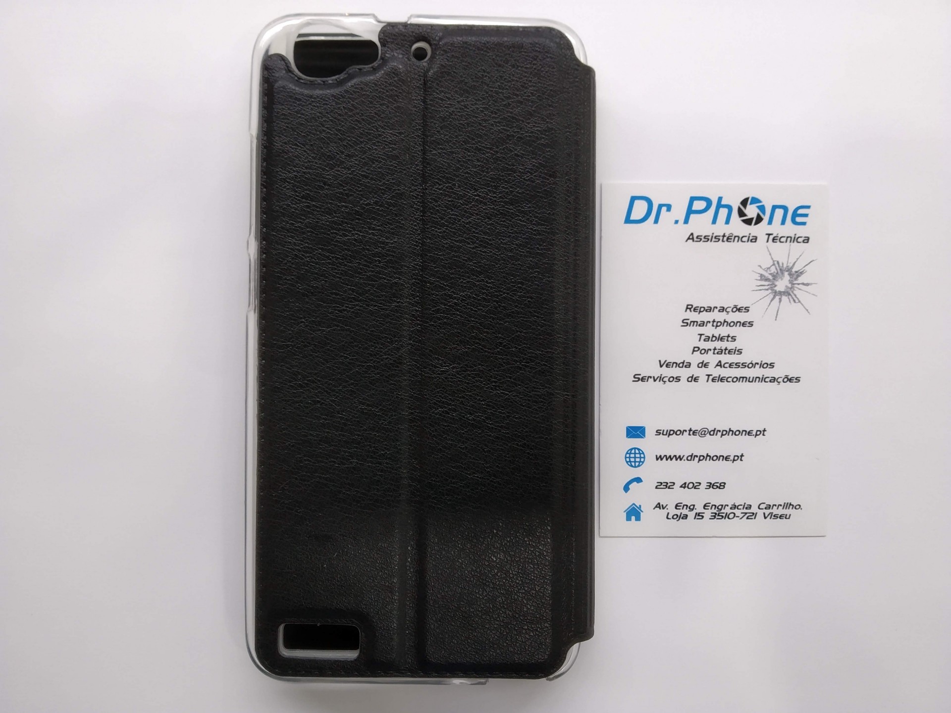 Capa preta para smartphone com visor transparente mostrando hora e cartão de visita branco da Dr.Phone