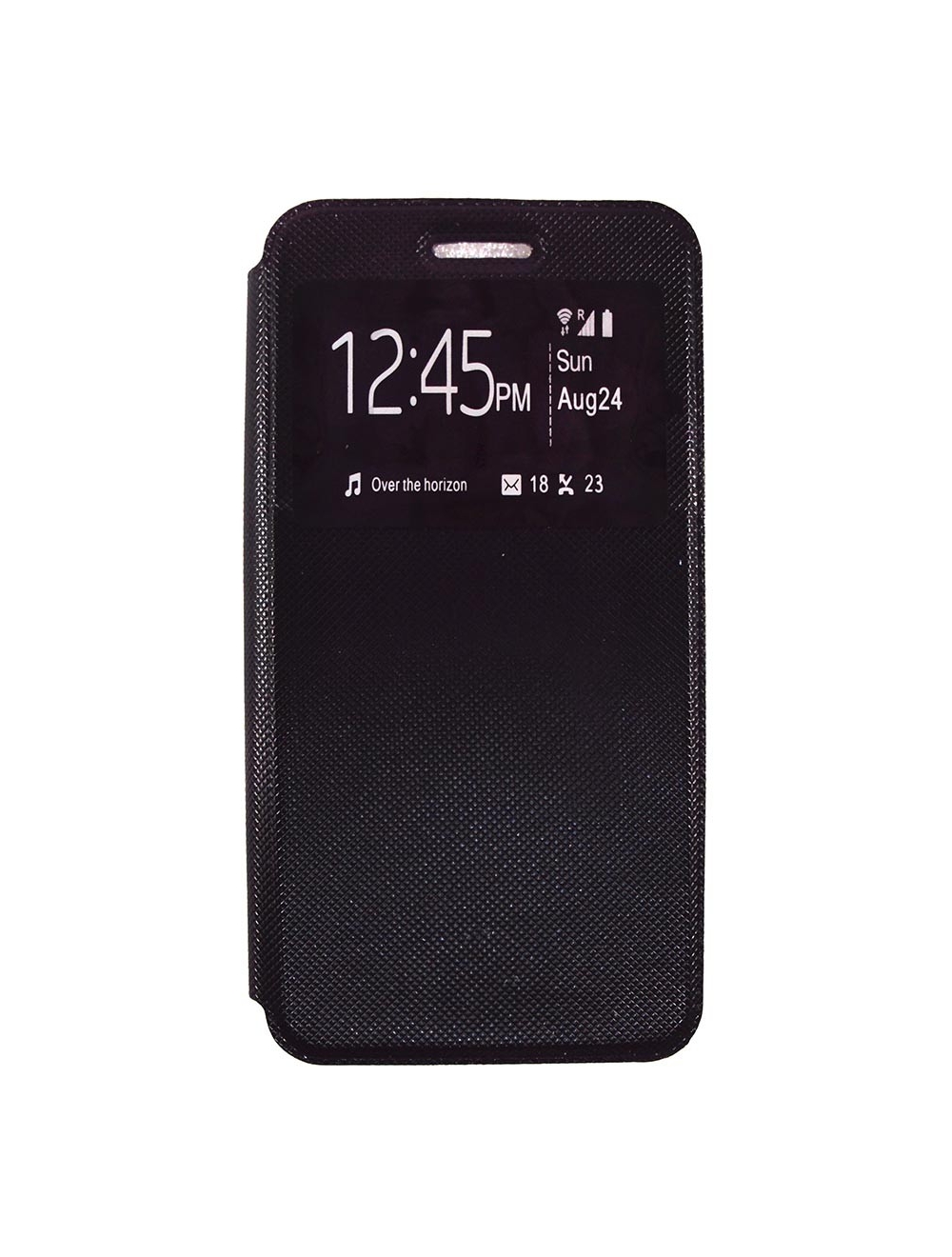 Capa de telemóvel preta com janela transparente a mostrar ecrã.