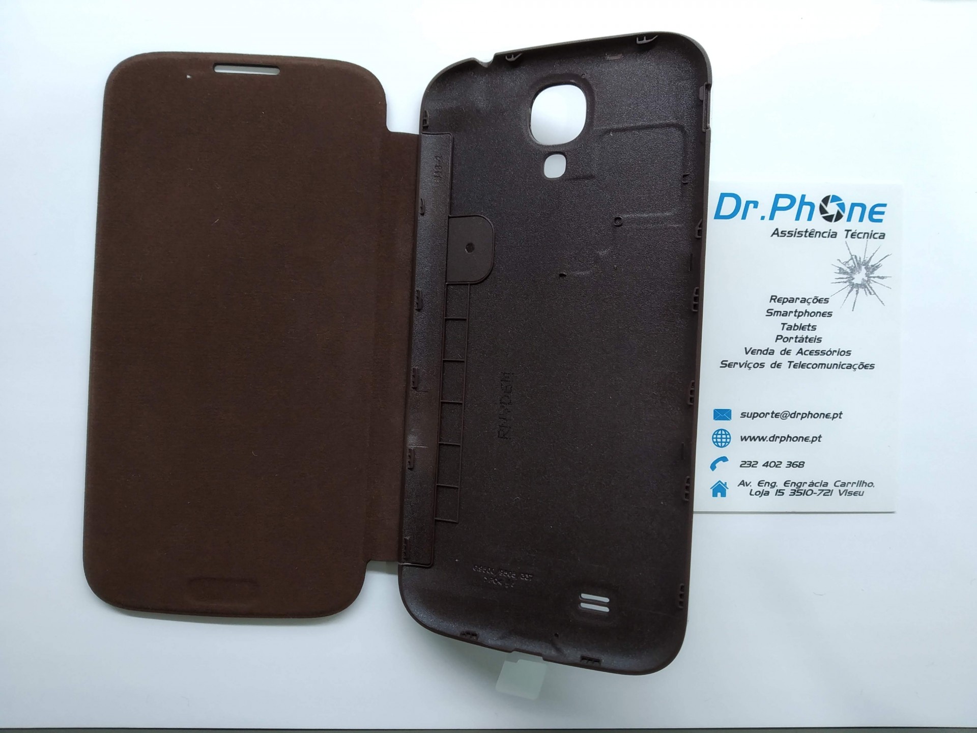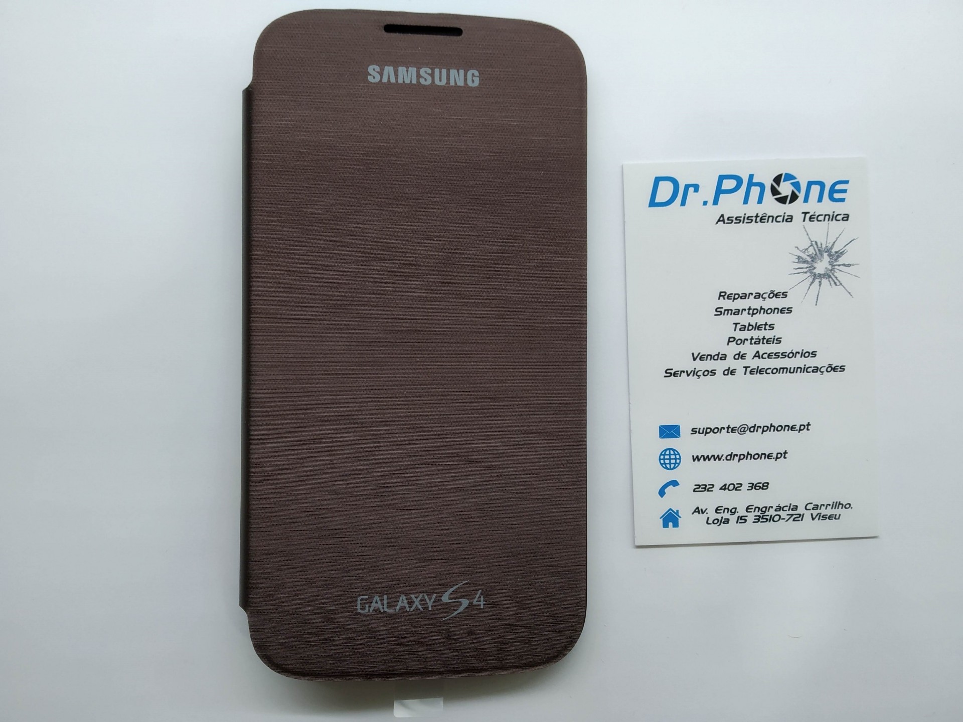 Capa castanha para Samsung Galaxy S4 ao lado de cartão de visita da Dr.Phone