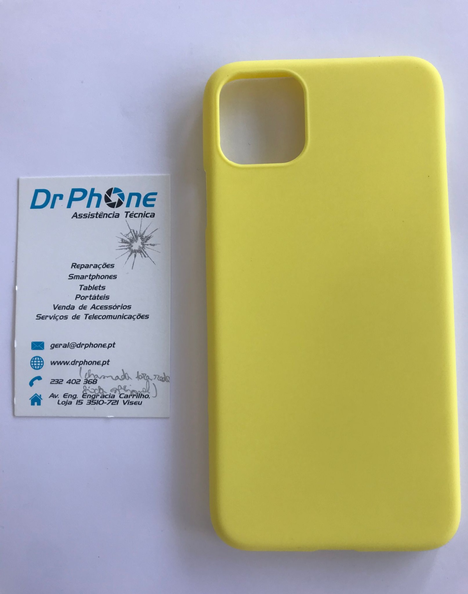 Capa de telemóvel amarela em silicone junto a cartão de visita branco com texto azul e preto
