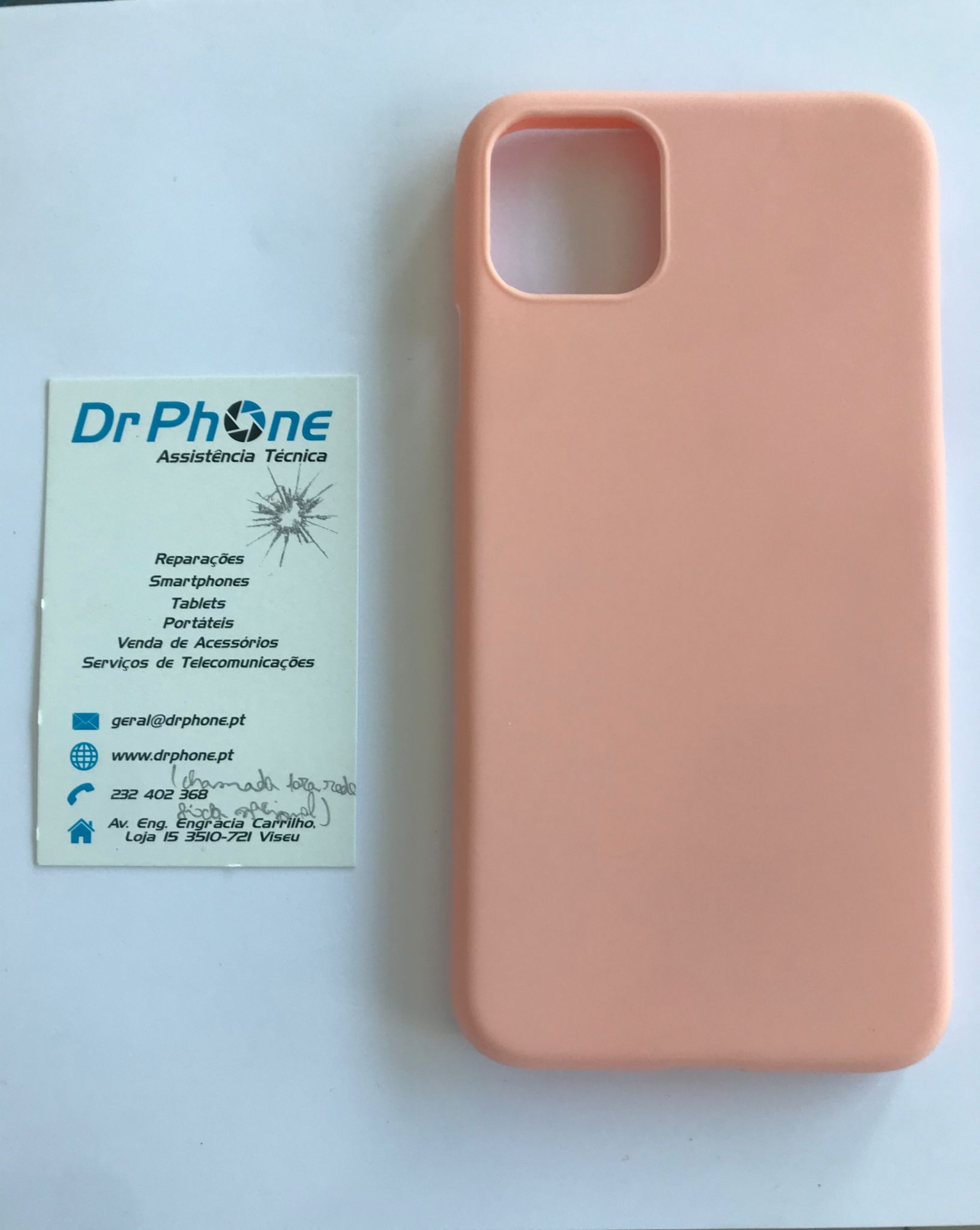 Capa de telemóvel rosa claro em silicone com cartão de assistência técnica Dr Phone ao lado