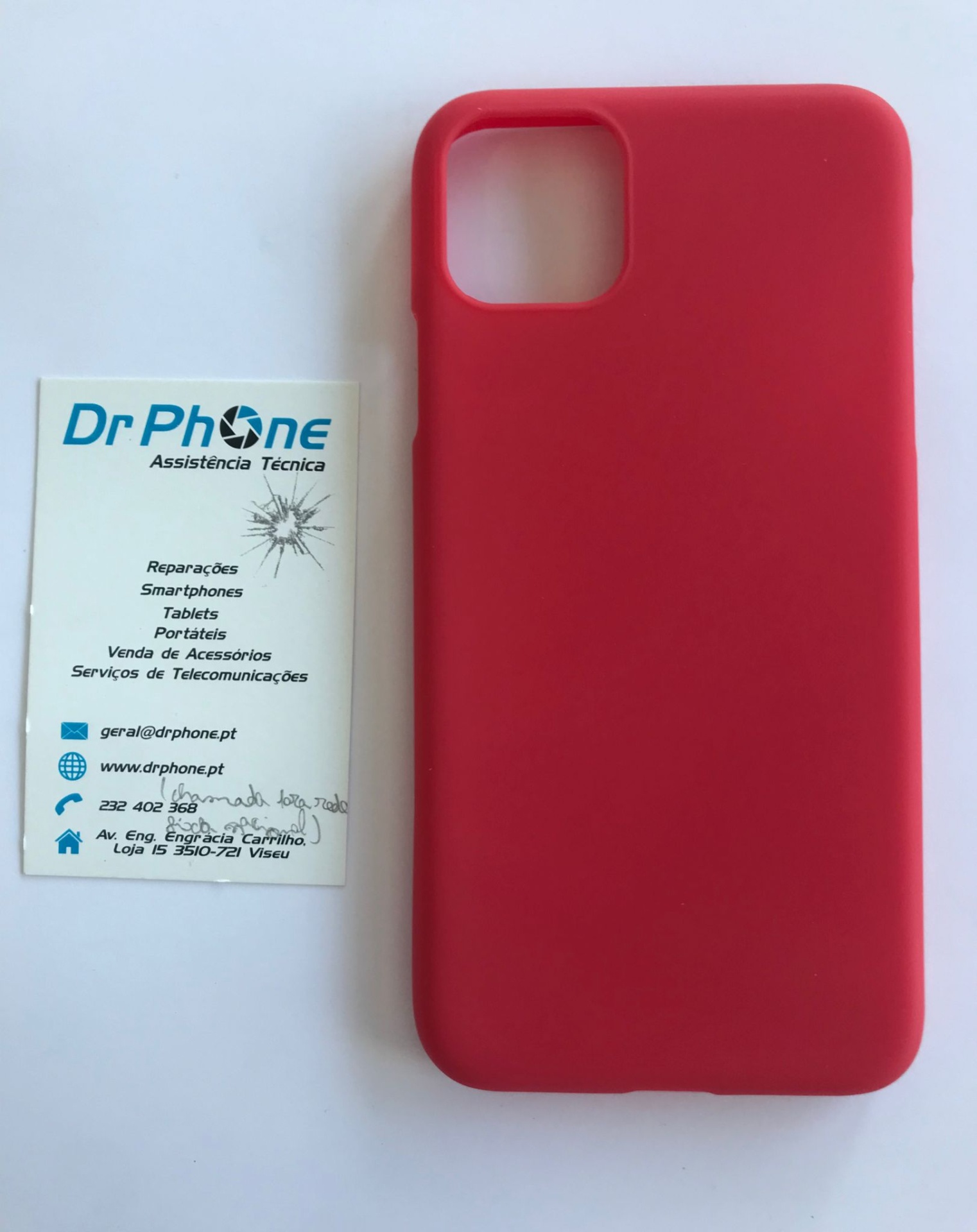 Capa de telemóvel vermelha ao lado de cartão de visita da Dr Phone