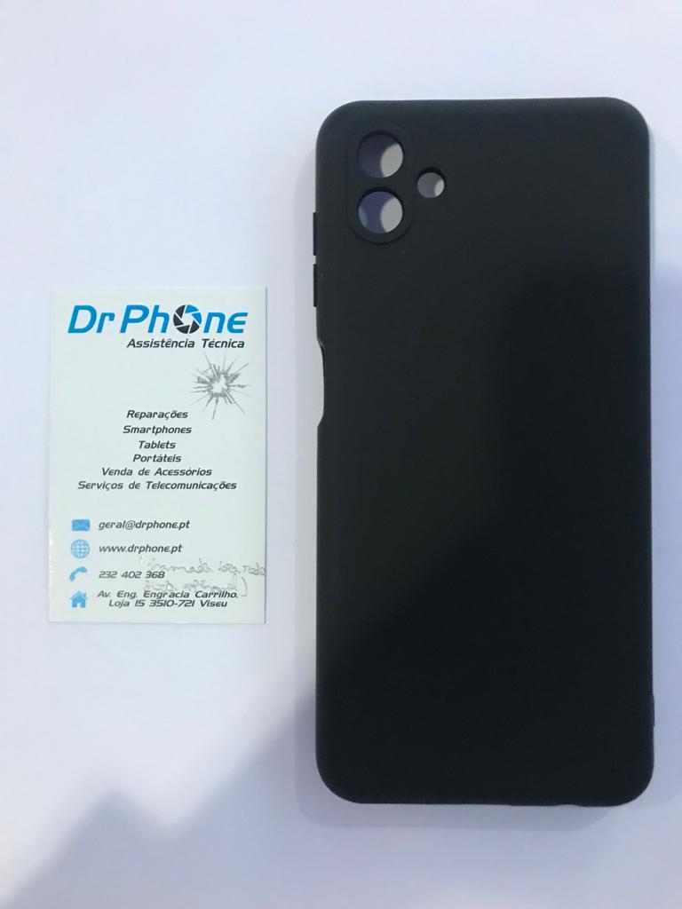 Capa protetora preta para smartphone ao lado de cartão de visita da DrPhone