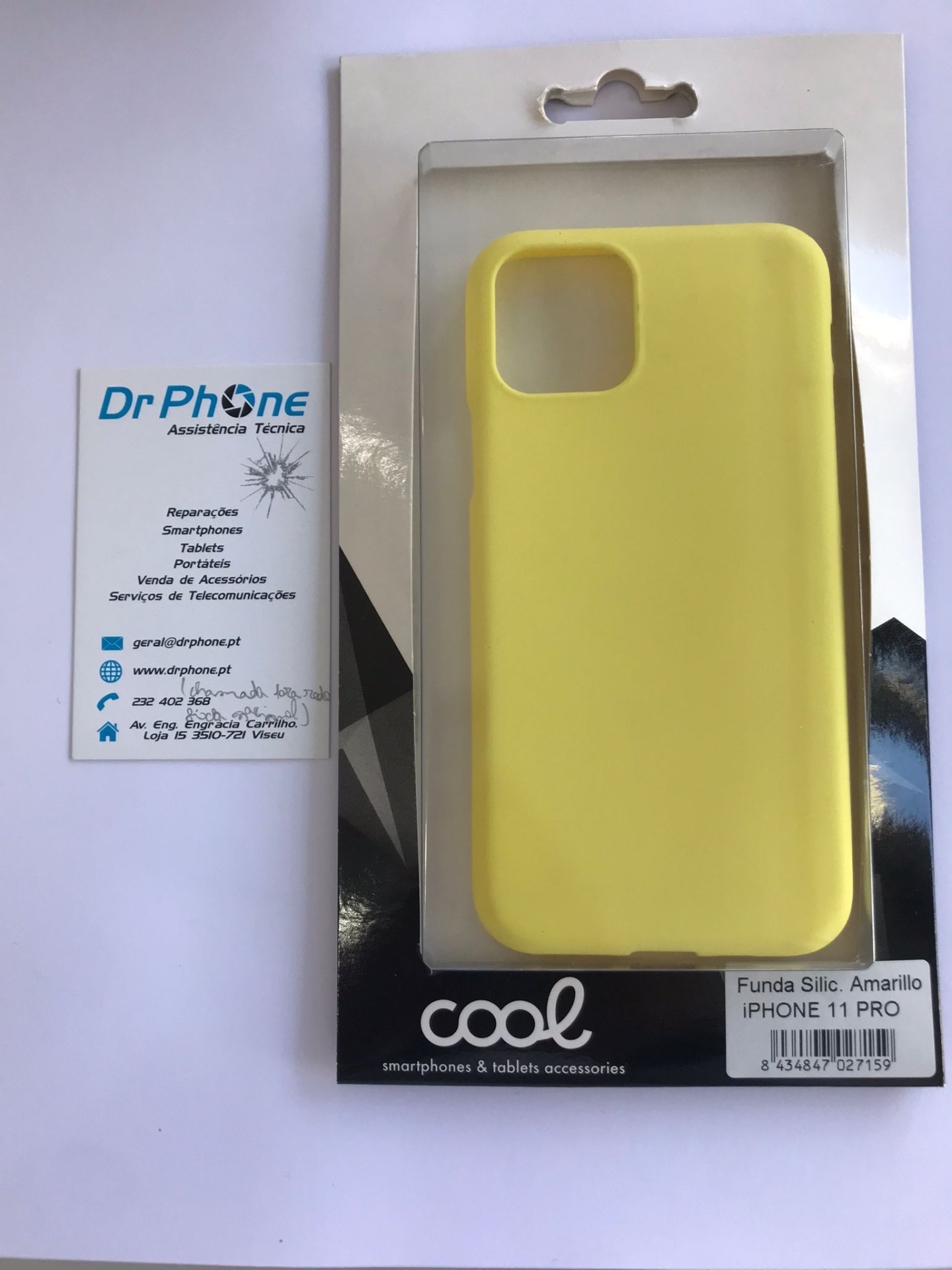 Capa amarela para iPhone 11 Pro em embalagem com cartão DrPhone ao lado