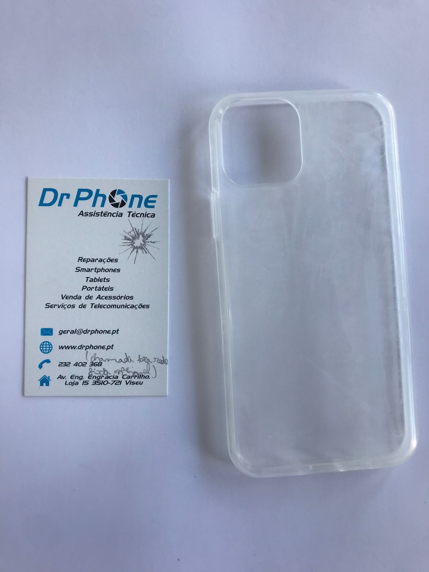 Capa transparente para smartphone ao lado de cartão de visita da Dr Phone em fundo branco.