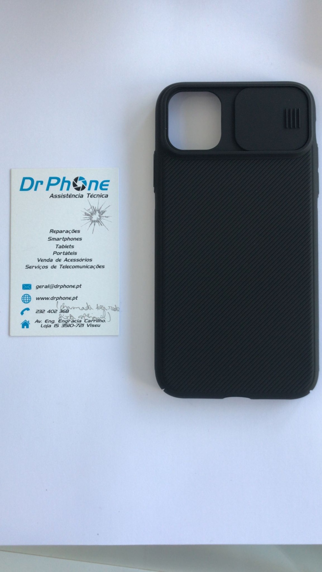 Capa preta para smartphone com tampa de câmara e cartão de visita de assistência técnica