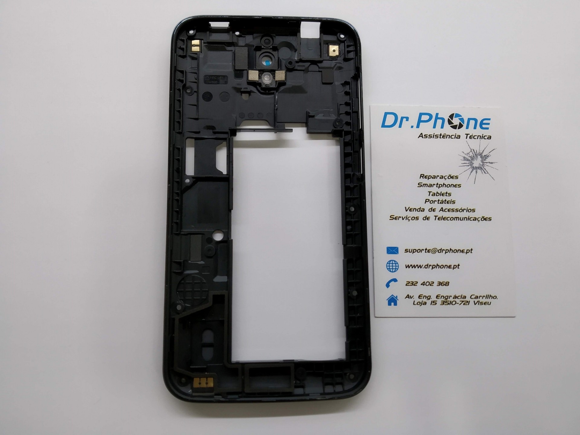 Carcaça preta de telemóvel com cartão de visita Dr.Phone