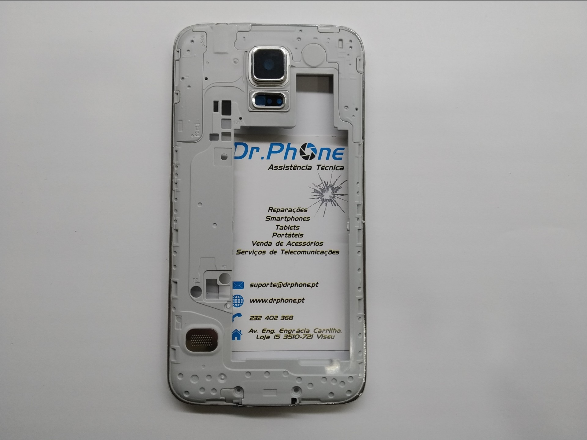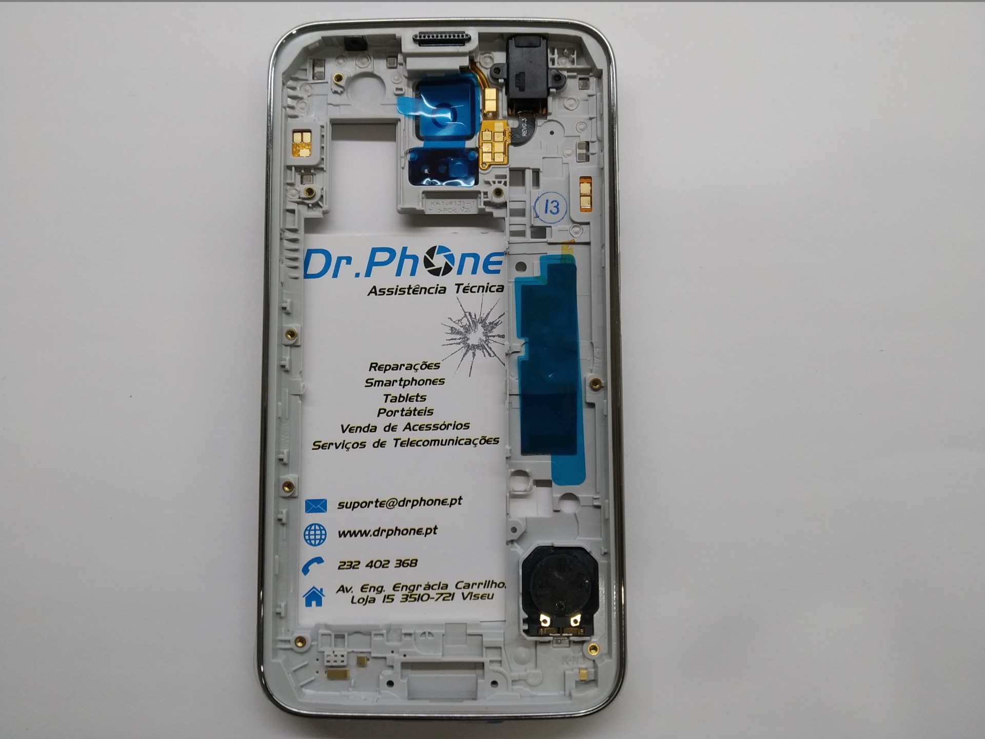 Parte traseira descascada de smartphone branco com folheto Dr.Phone visível