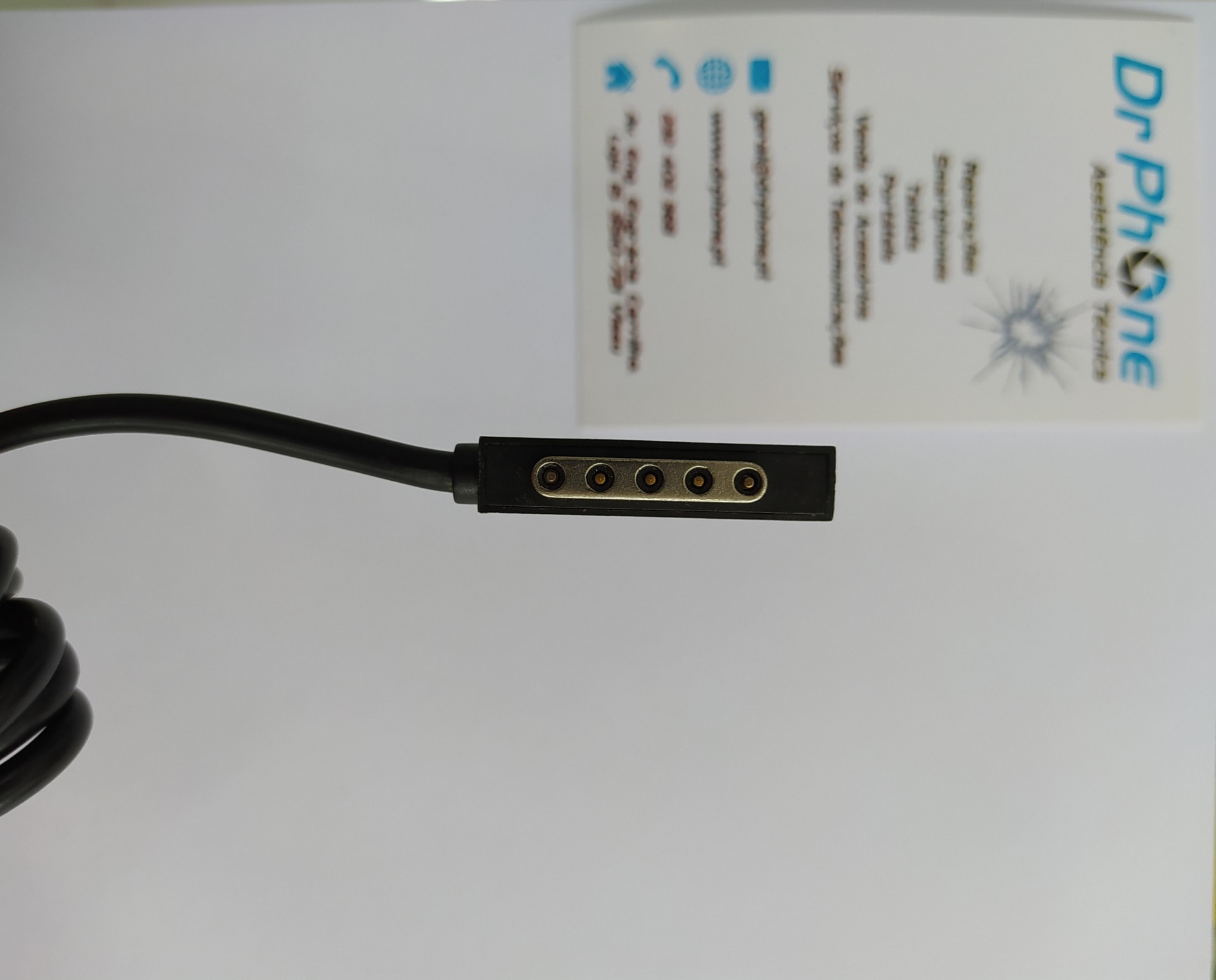 Cabo preto com conector magnético de seis pinos dourados e cartão DR. PHONE branco ao fundo