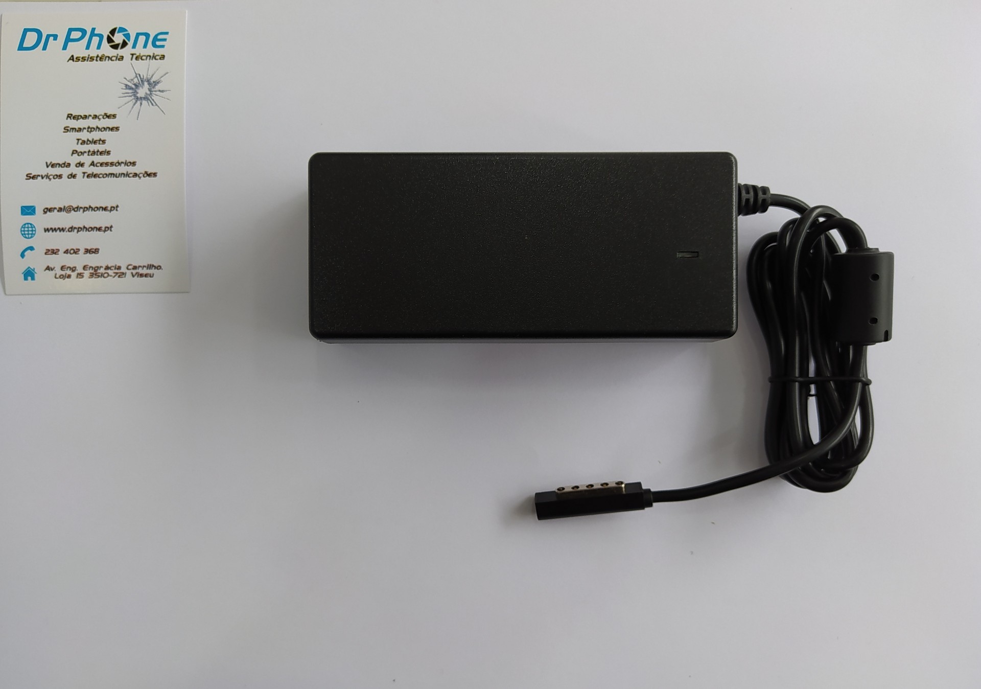 Carregador portátil preto com cabo enrolado junto a cartão de visita da Dr Phone