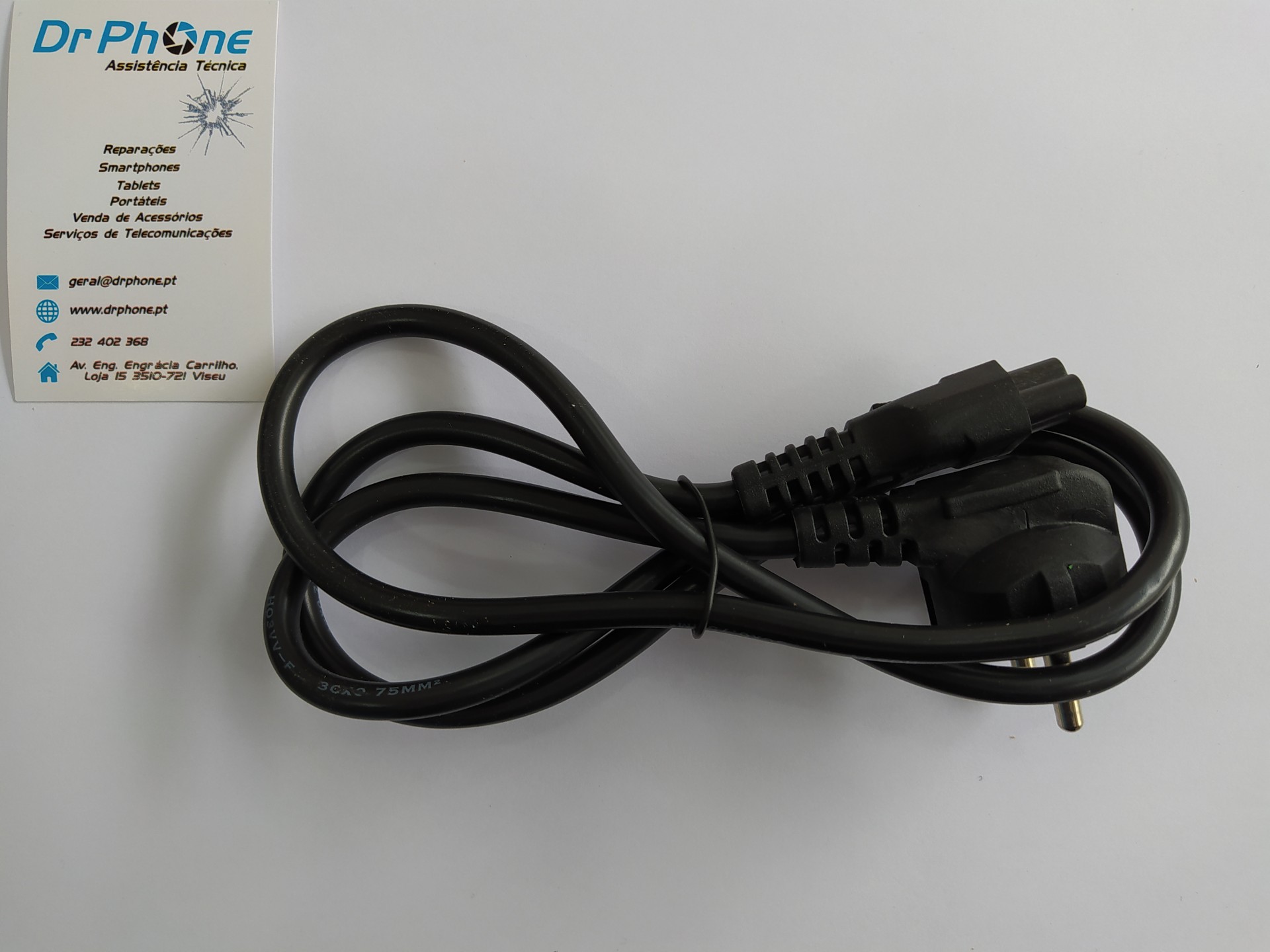 Cabo elétrico preto com duas fichas macho e uma ficha fêmea junto a cartão de visita