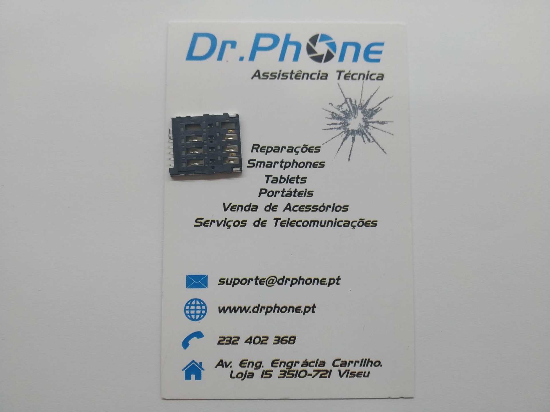 Cartão de visita de assistência técnica Dr.Phone com peça eletrónica e texto em português.