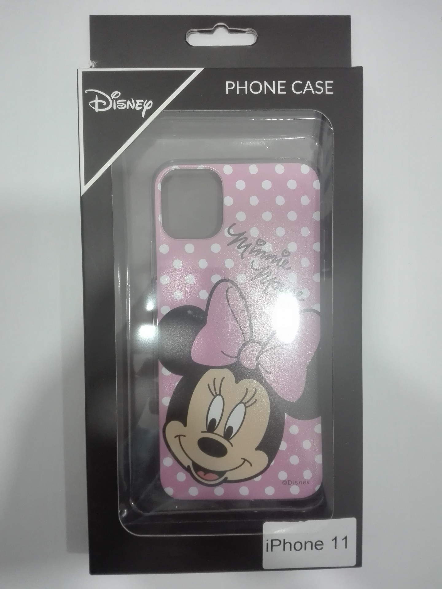 Estojo para iPhone 11 com imagem da Minnie Mouse numa embalagem preta