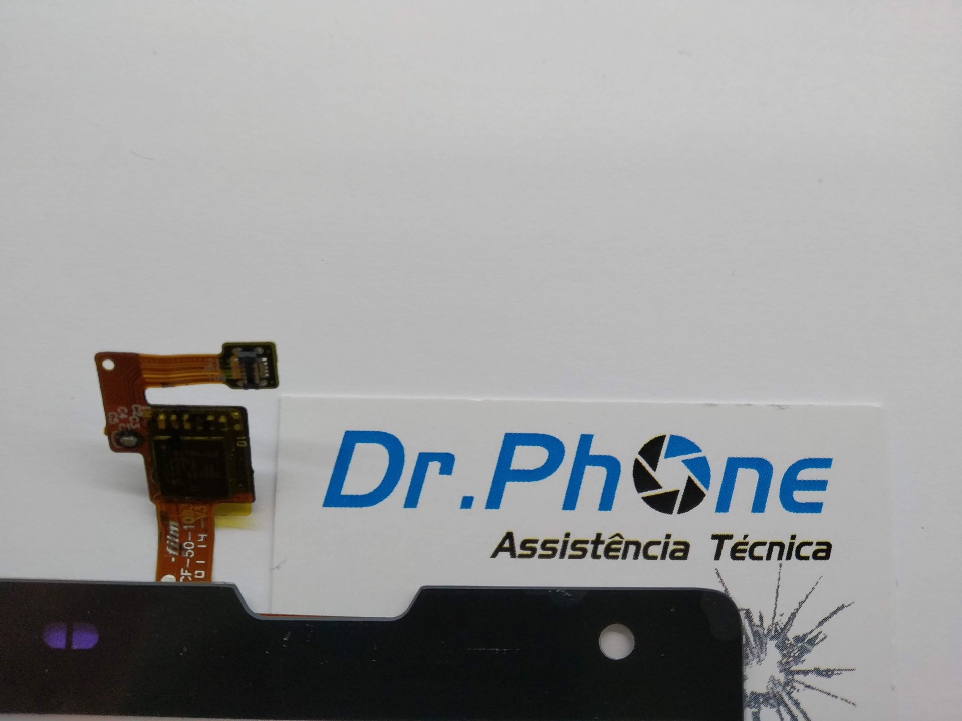 Componente eletrónico com cabo flexível laranja sobre cartão branco com texto azul Dr.Phone Assistência Técnica