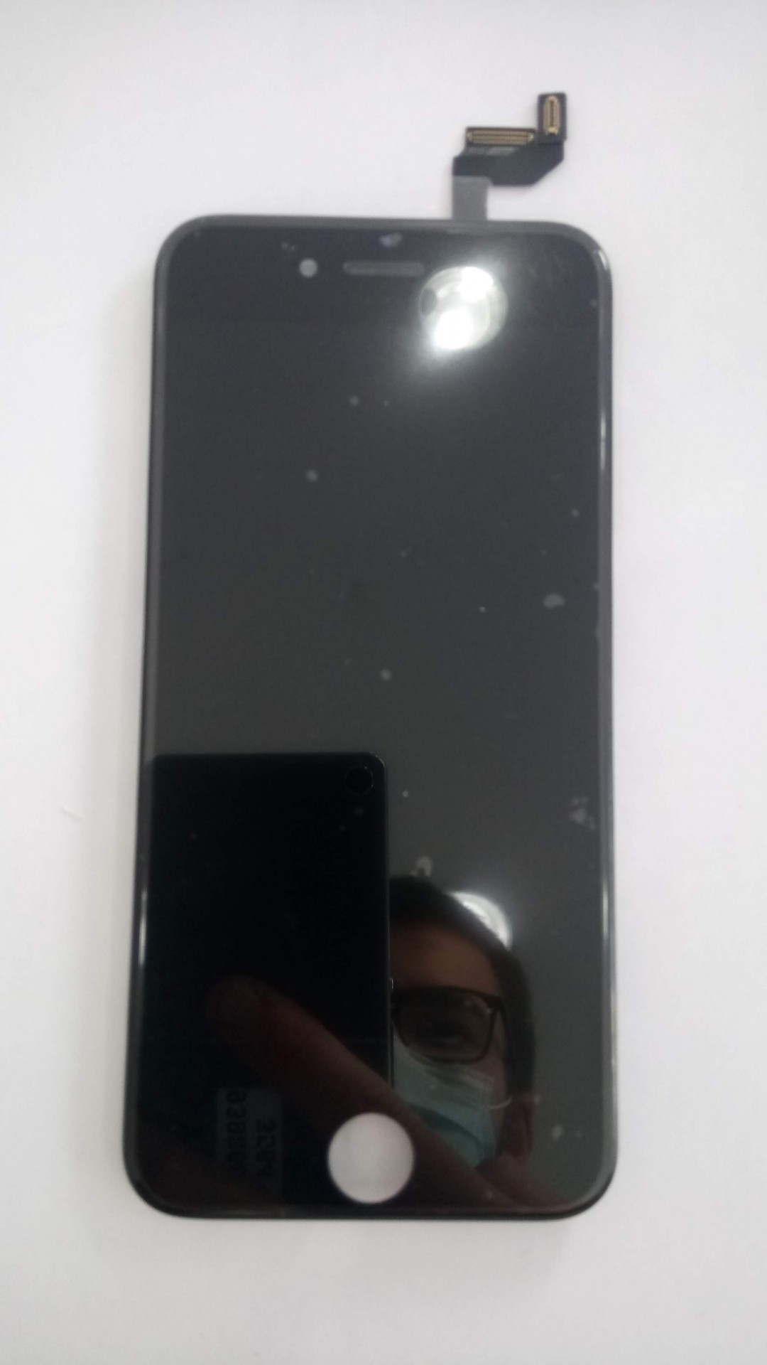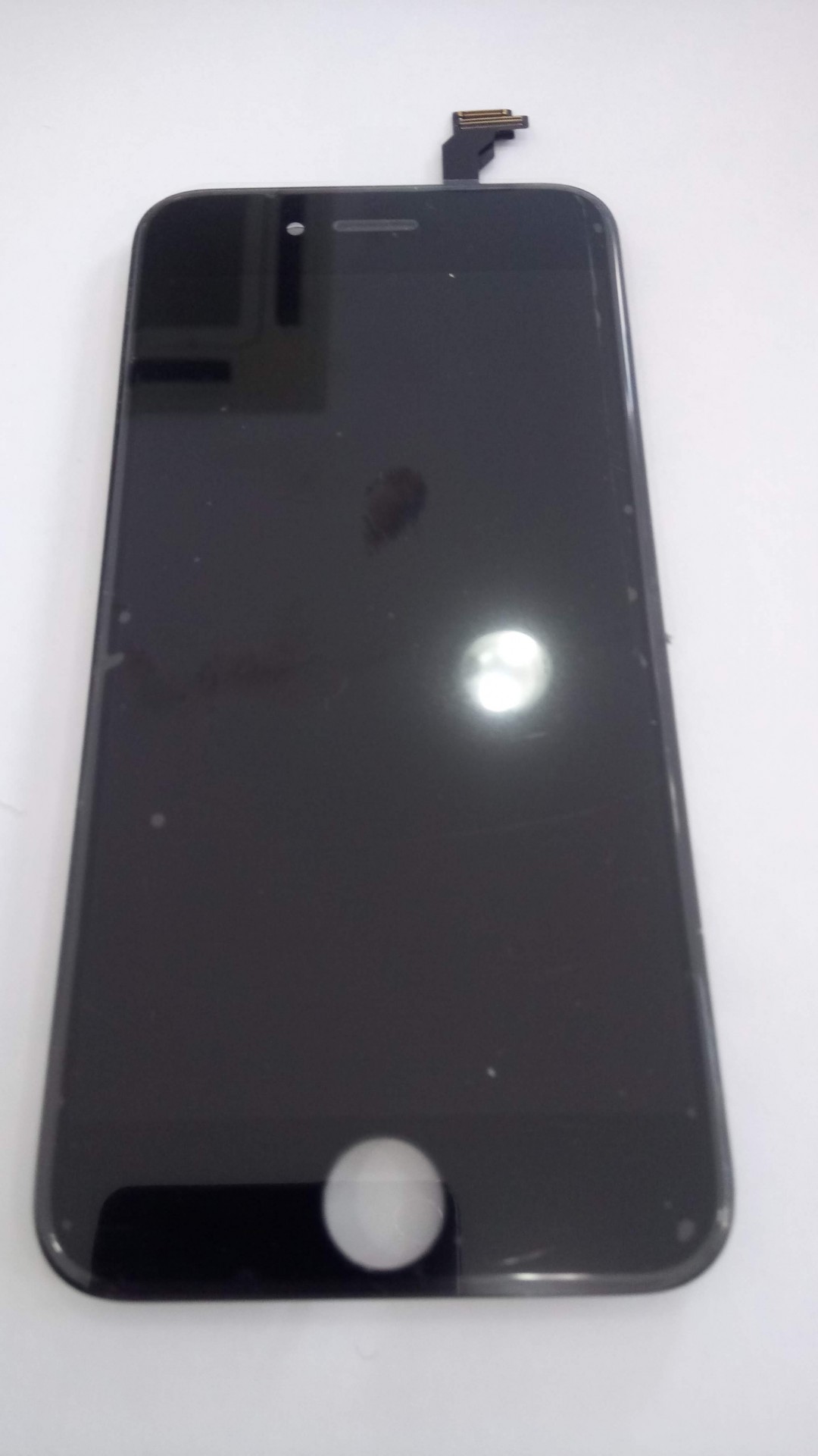 Ecrã frontal preto de smartphone com botão home e conector flex