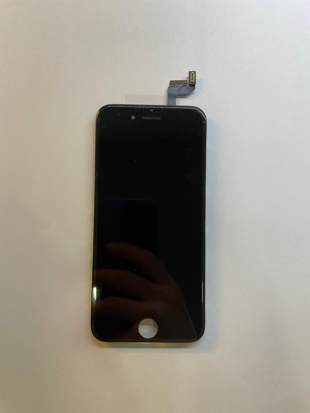 Pantalla frontal preta de smartphone com botão circular e conector flex